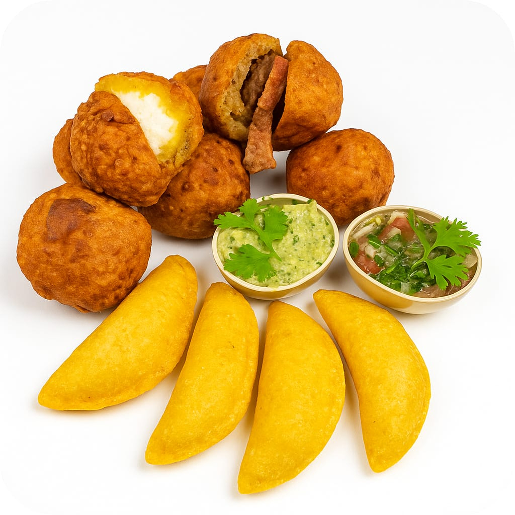 4 empanaditas, 4 marranitas, 4 aborrajados