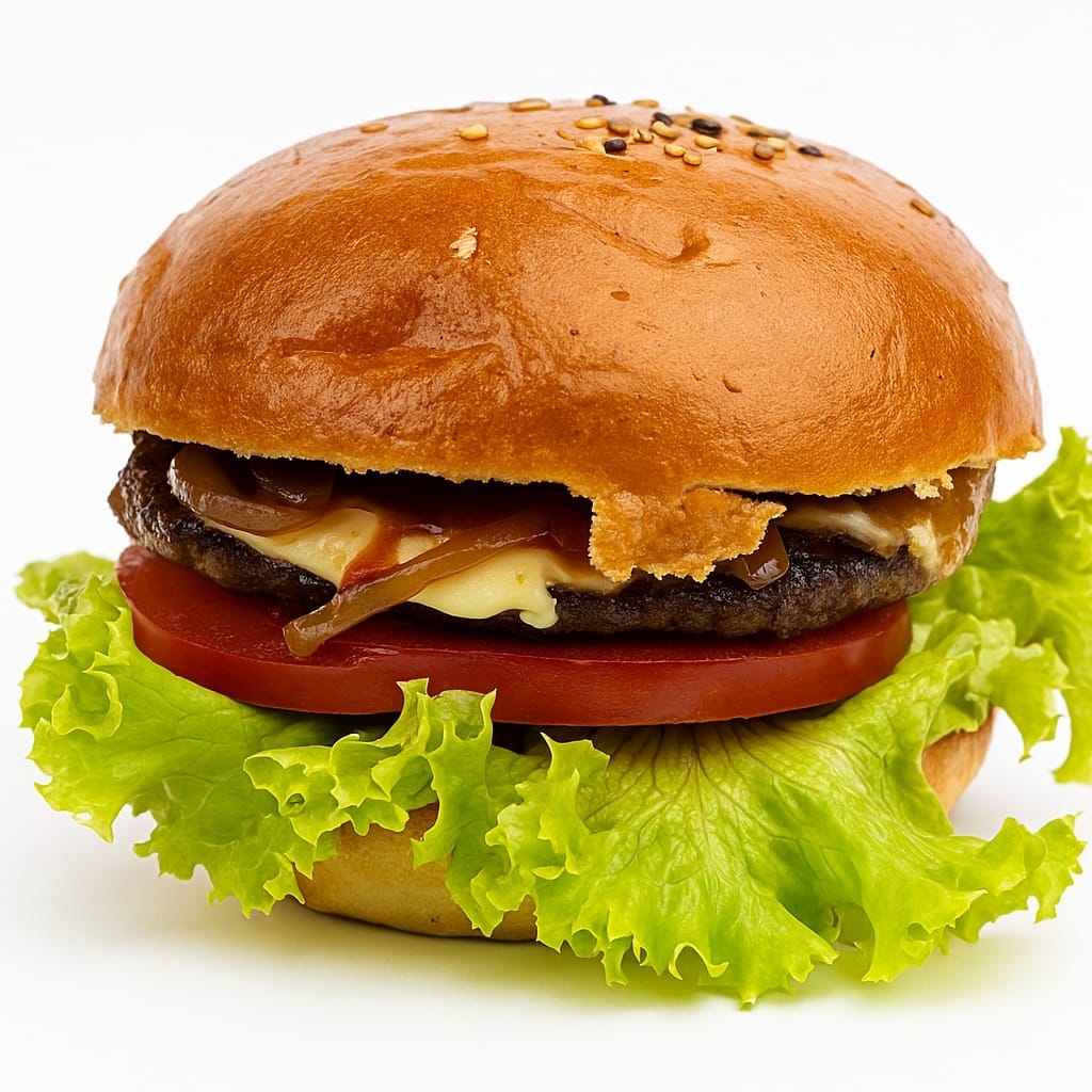 Pan, carne, lechuga, tomate, cebolla caramelizada, loncha de queso, salsa de la casa.