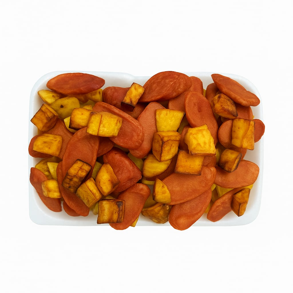 Papa amarilla, salchicha, maduro, salsa de la casa.