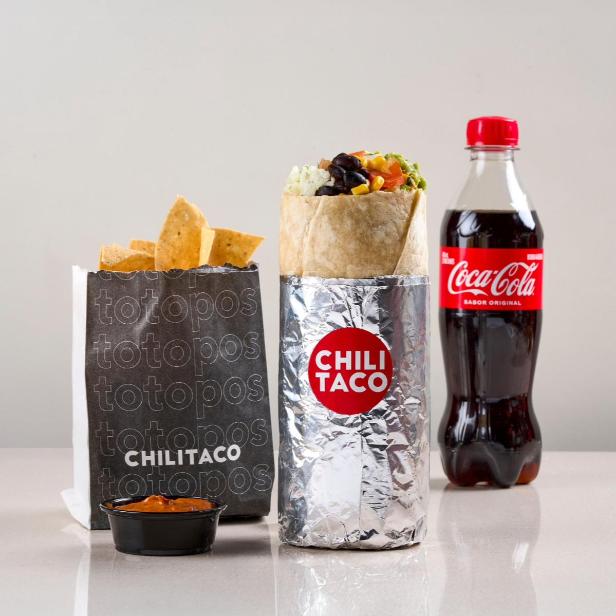 Burrito grande con proteína, bases, toppings y salsas a elección acompañados de totopos con salsa o guacamole o postre y bebida.