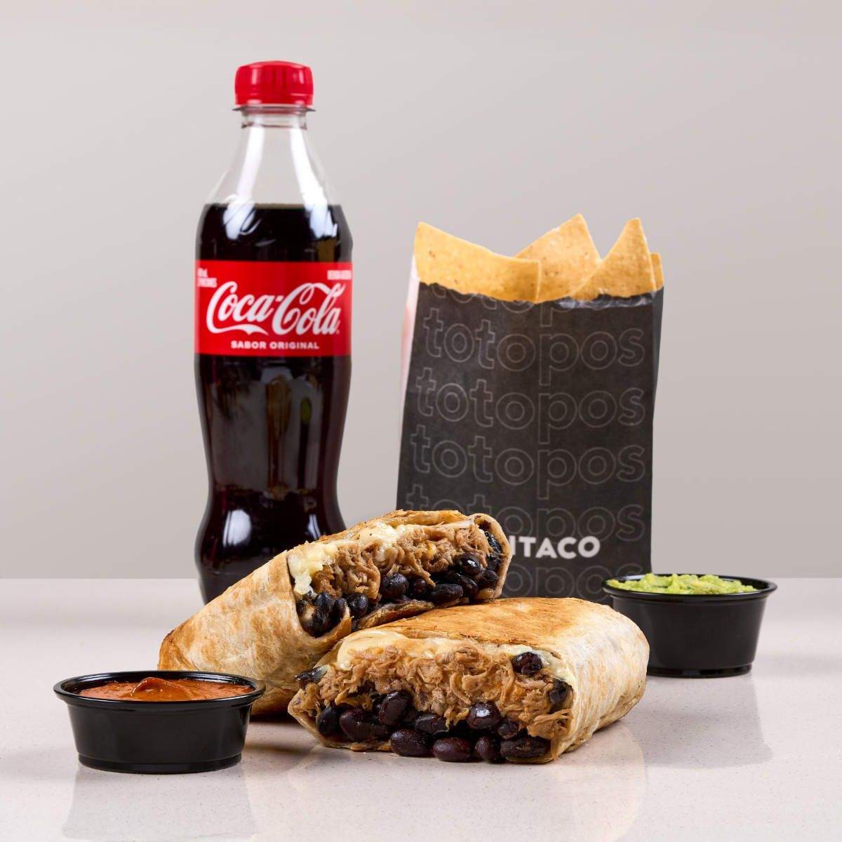 Burrito grande con proteína, bases, toppings y salsas a elección acompañados de totopos con salsa o guacamole o postre y bebida.