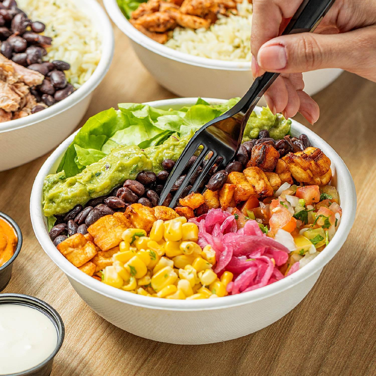 Bowl con guacamole, bases, toppings y salsas a elección acompañados de totopos con salsa o guacamole o postre y bebida.