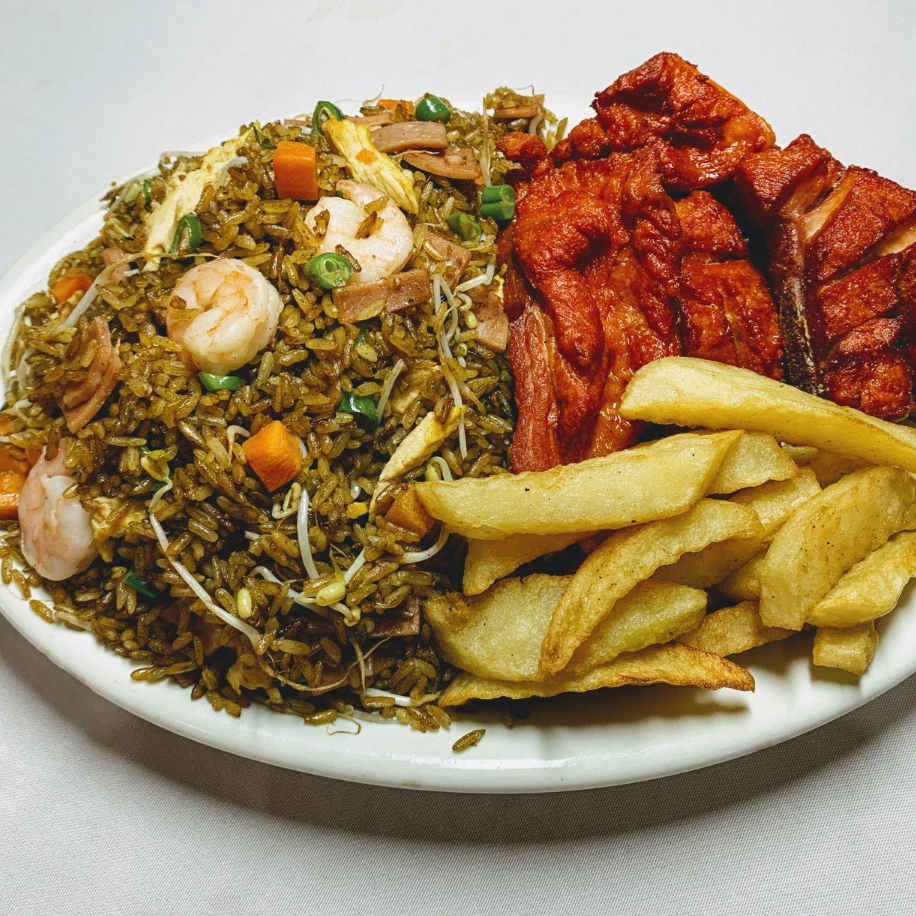 Pollo, cerdo, jamón, camarón, papas fritas y 1/4 de pollo.