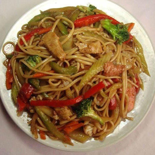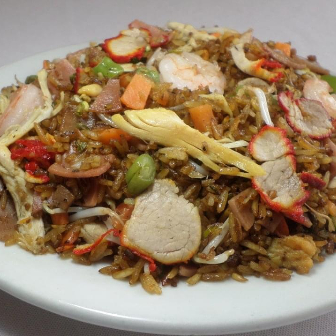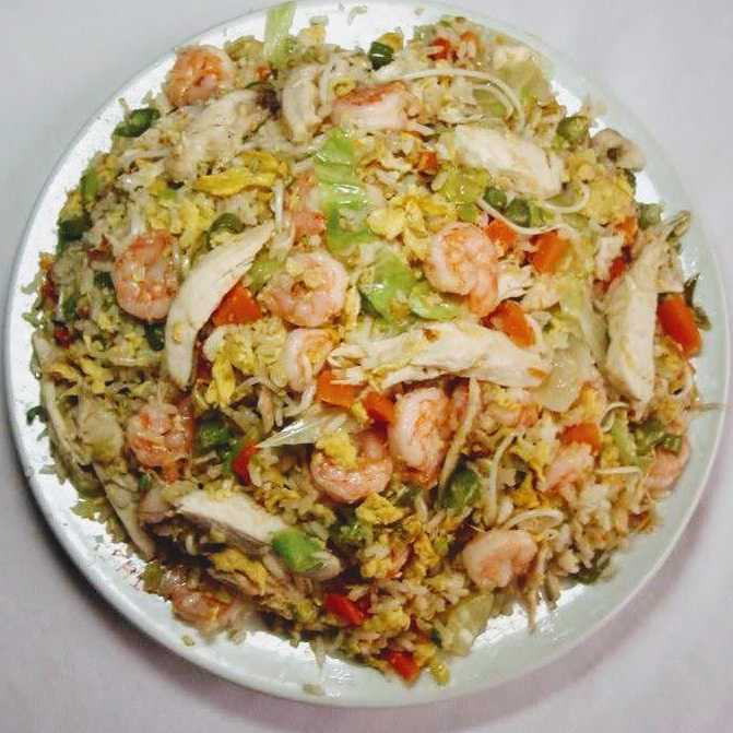 Pollo, cerdo, jamón, camarón, verduras y agridulce.