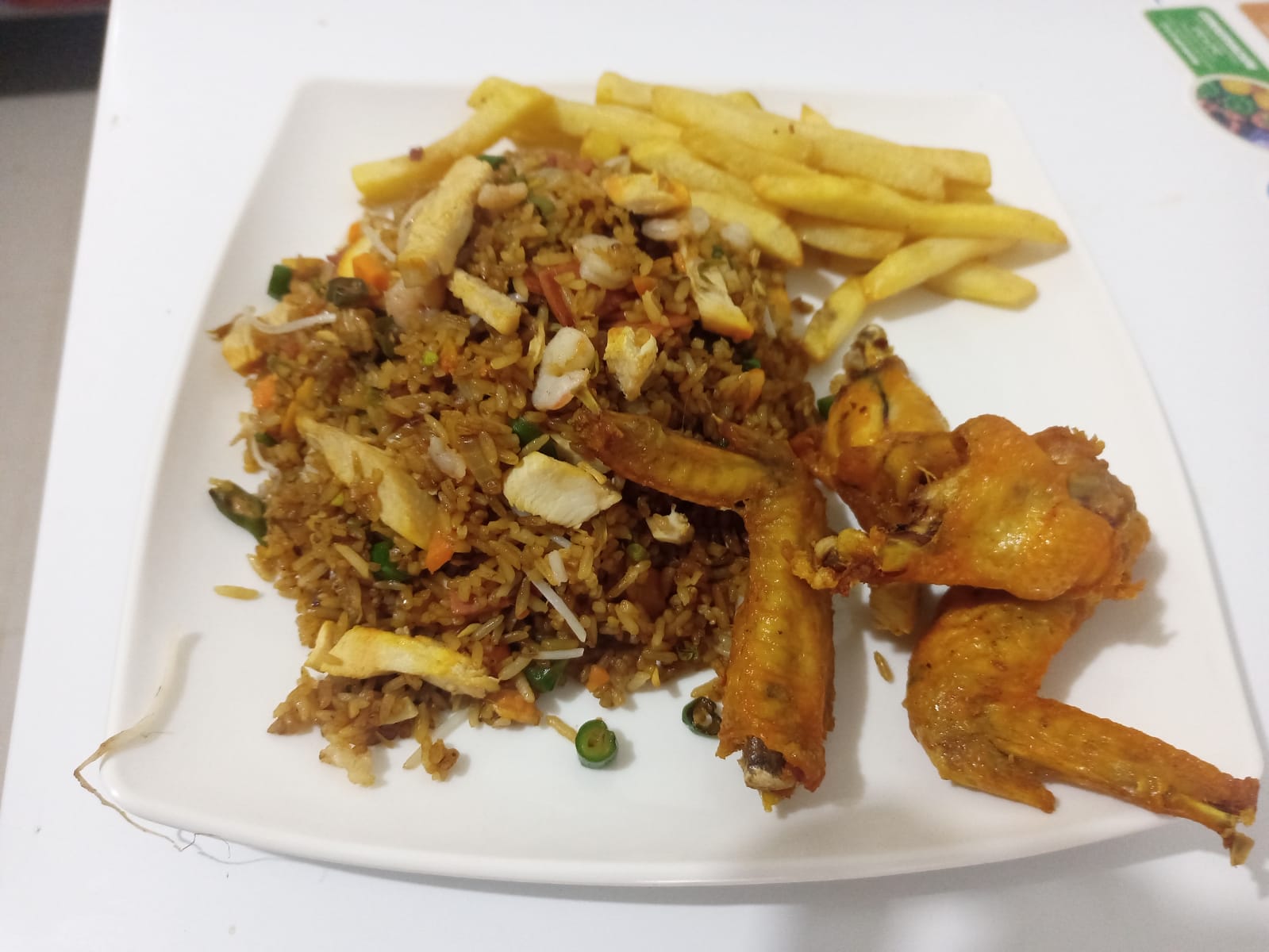 Arroz chino con papas a la francesa con medio pollo frito promedio para 3 A4 personas