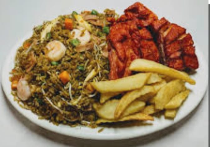 500gr de arroz frito con camarones, habichuela, zanahoria, raíces chinas, carne + 100gr de Chuleta + guarnición de papas a la francesa (50 gr ) para una persona
