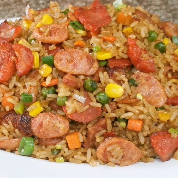 El Arroz Frito Ranchero de 3 a 4 Personas contiene salchicha, costilla, chorizo, habichuela y maíz tierno.