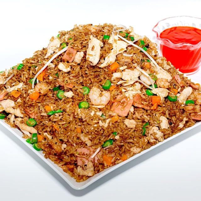 250gr de arroz chino, Pollo cerdo, camarón, costilla ahumada, jamón, habichuela, zanahoria, raíces.