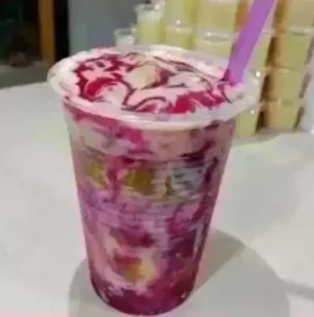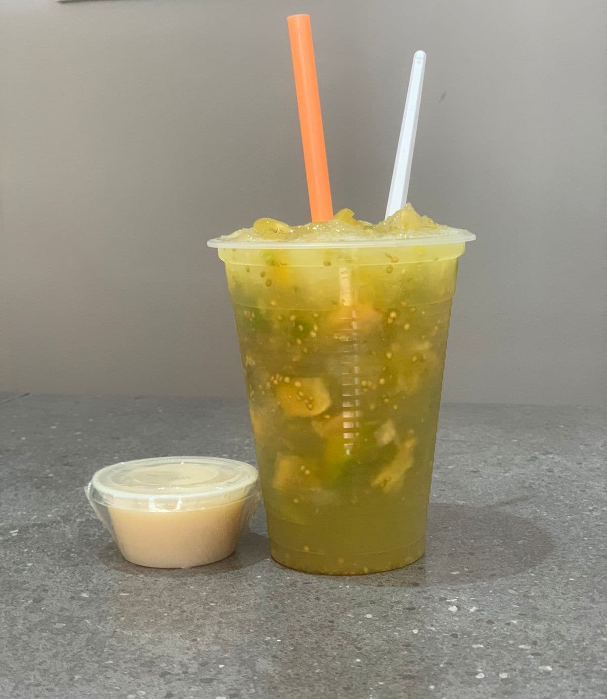 Vaso 16 onzas, maracuyá, melao de la casa y con hielo raspado.