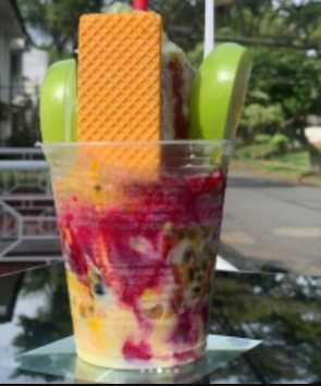Contenedor de 24 onzas ( banano, piña, mango, fresa, papaya, maracuyá, lulo y manzana, 2 onzas de leche condensada y un paquete de galletas wafer de 4 unidades).