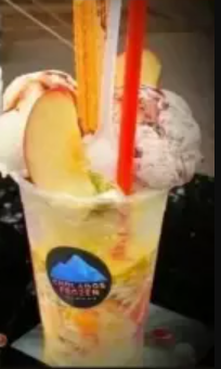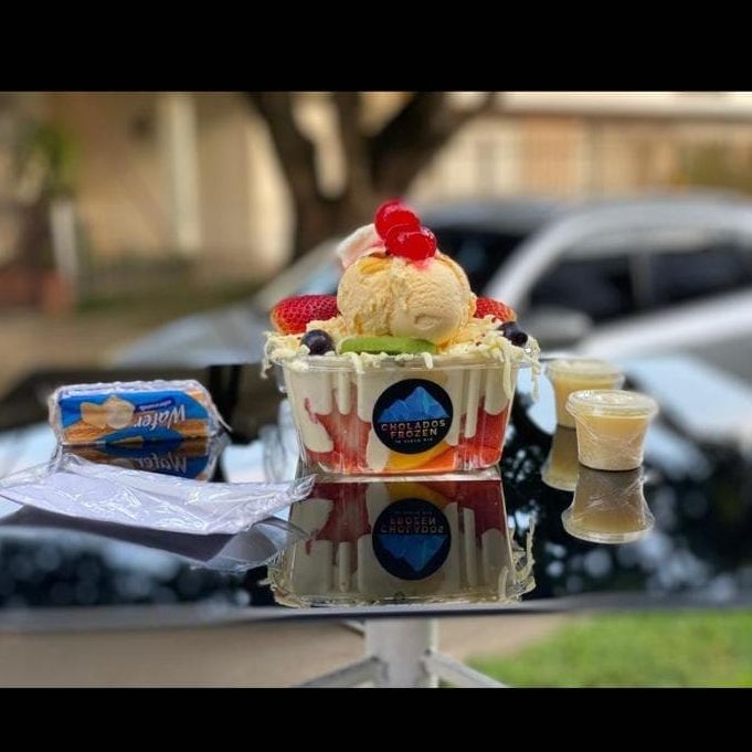 Contenedor de 32 onzas ( hielo raspado, banano, piña, mango, fresa, papaya, maracuyá, lulo y manzana, 2 onzas de leche condensada y un paquete de galletas wafer de 2 unidades, dos bolas de helado vainilla, fresa, chocolate, frutos rojos, macadamia, brownie o crema de whisky).