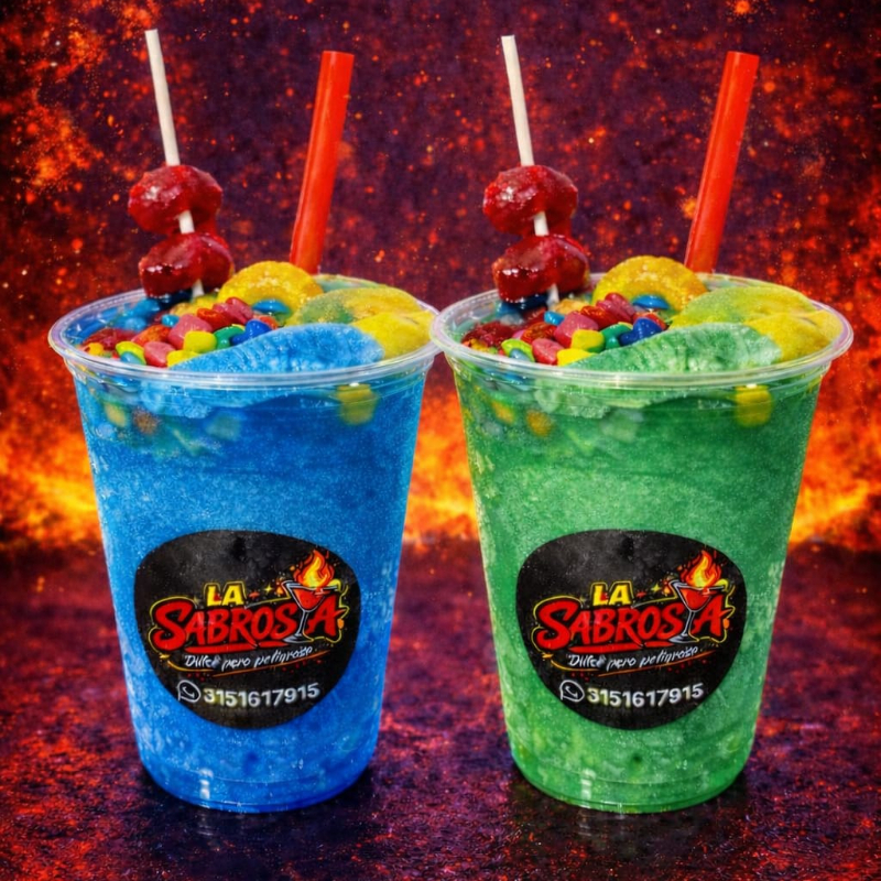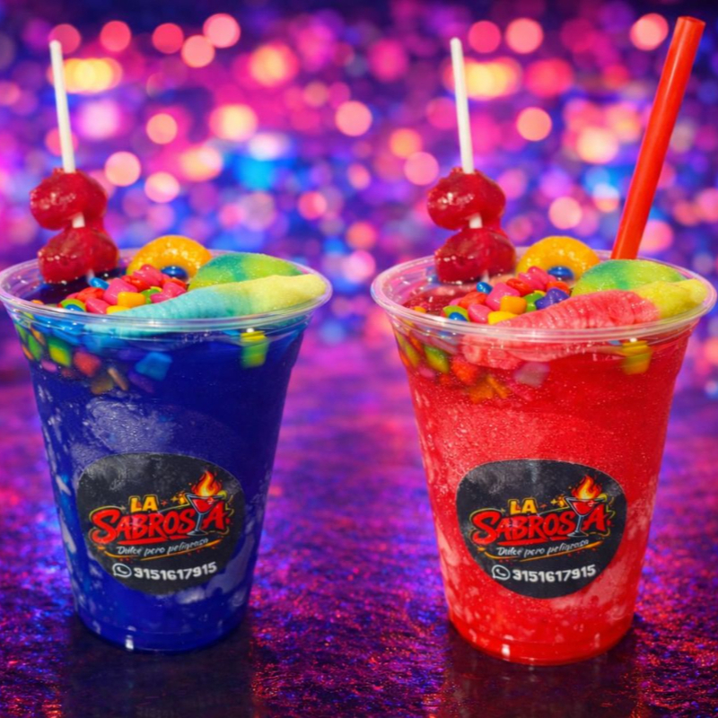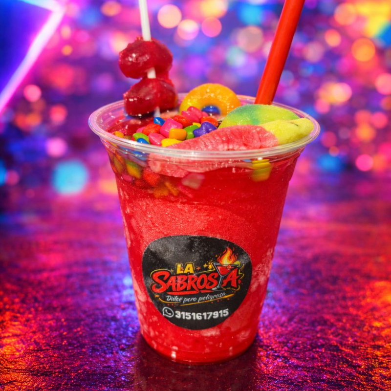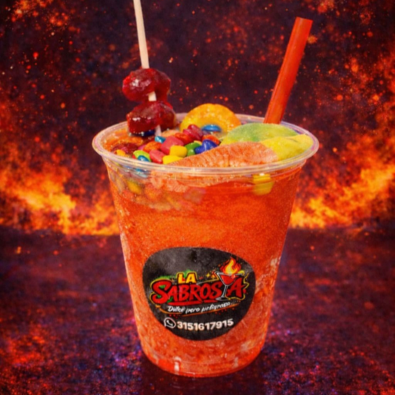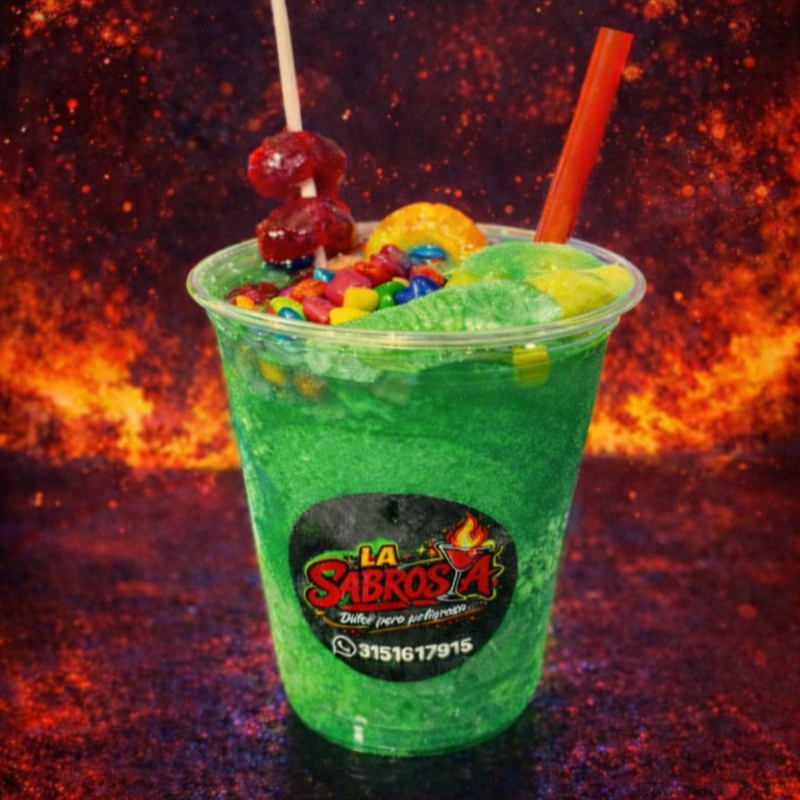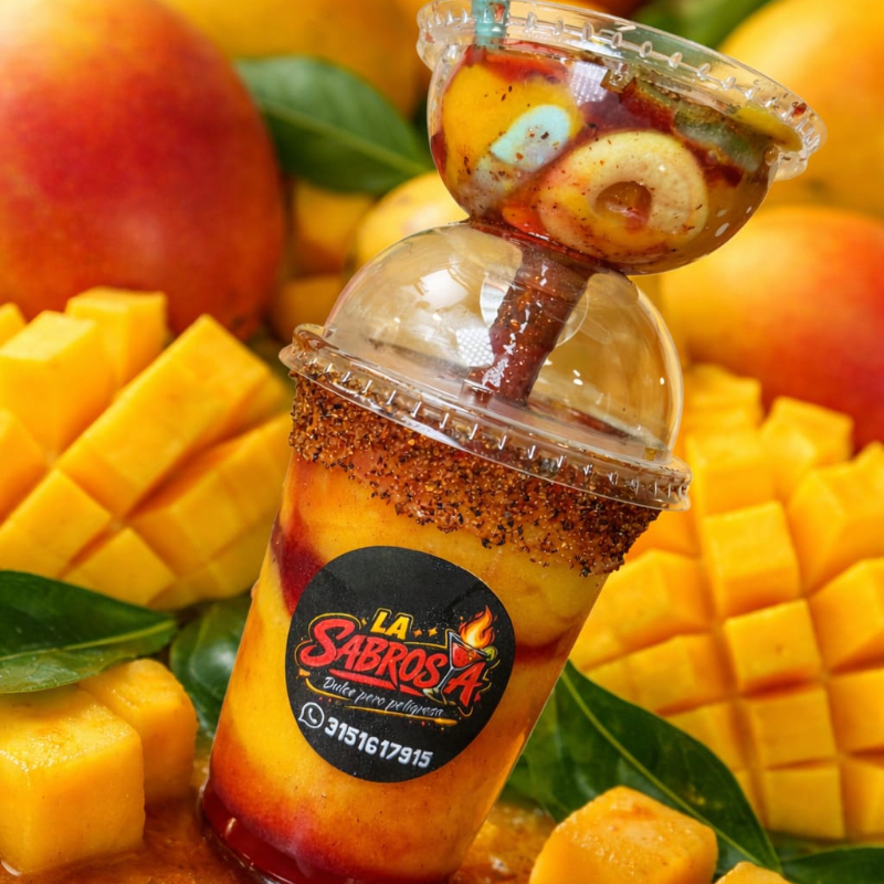 Granizado de mango, con trocitos de mango, chamoy, tajin, lechera, banderilla y gomitas enchiladas