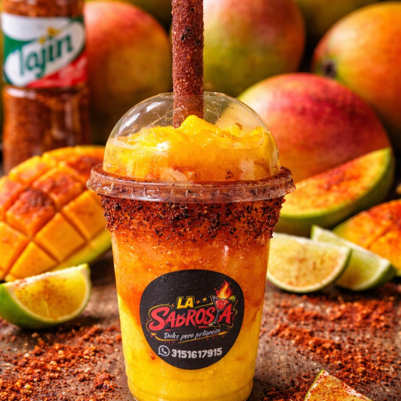 GRANIZADO DE MANGO, TROCITOS DE MANGO, CHAMOY, TAJIN, BANDERILLA