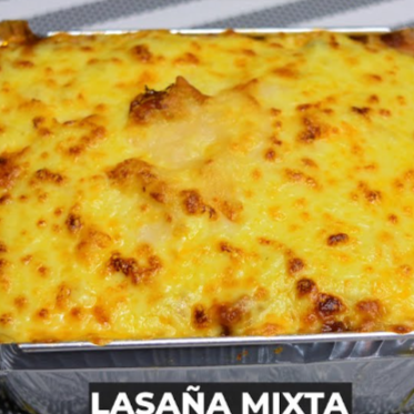 pasta , carne molida, pollo desmechado, champiñón, queso mozarela gratinado