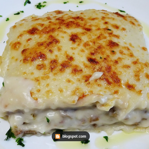 pasta de lasaña, pollo desmechado, champiñones y queso mozarela