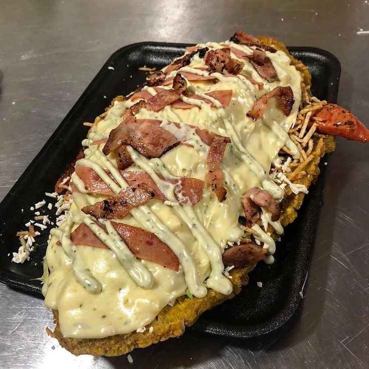 Maicitos dulce, pollo, jamón, tocineta, salsa en crema de lecha y queso.
