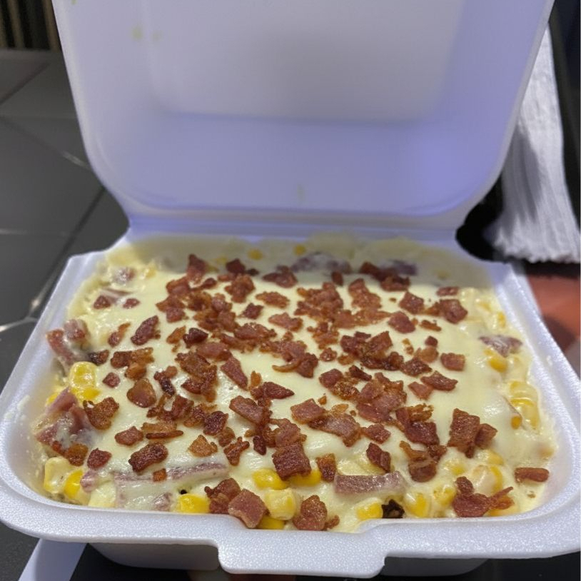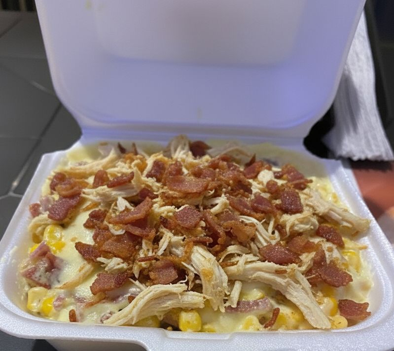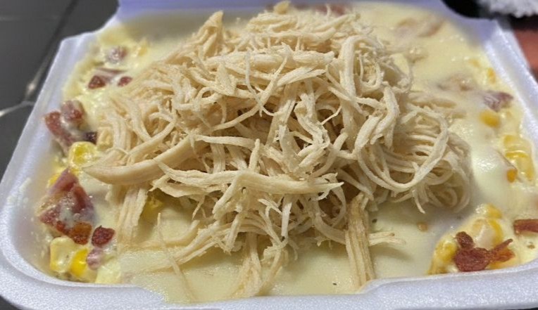 Maicitos dulce, pollo desmechado, tocineta, salsa en crema de lecha y queso.