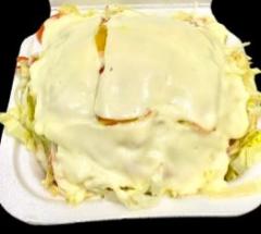 Papas a la francesa, salchicha, pollo desmechado, tocineta, lechuga, ripio, salsas y triple queso.