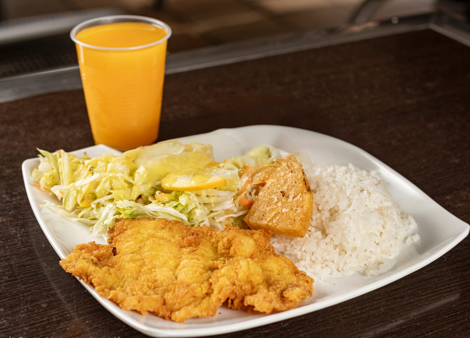Deliciosa combinación de Arroz, maduro, carne, chicharrón más arepa y huevo. Incluye 1 bebida que puede ser Café Negro, Café en Leche, Jugo del día o té frío para acompañar.
