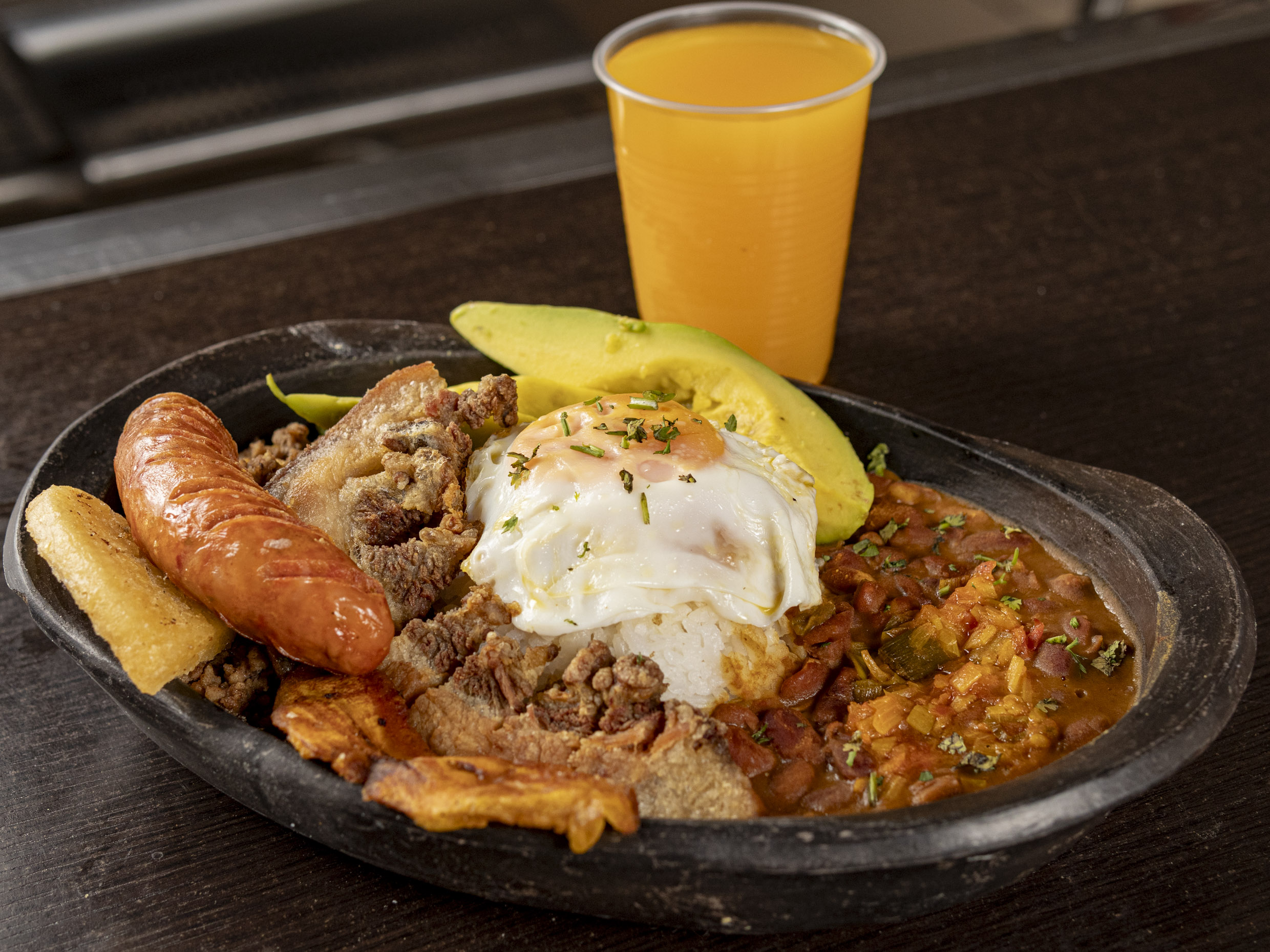 Bandeja con fríjoles, carne molida, chorizo, arepa, chicharrón, arroz y jugo del día.