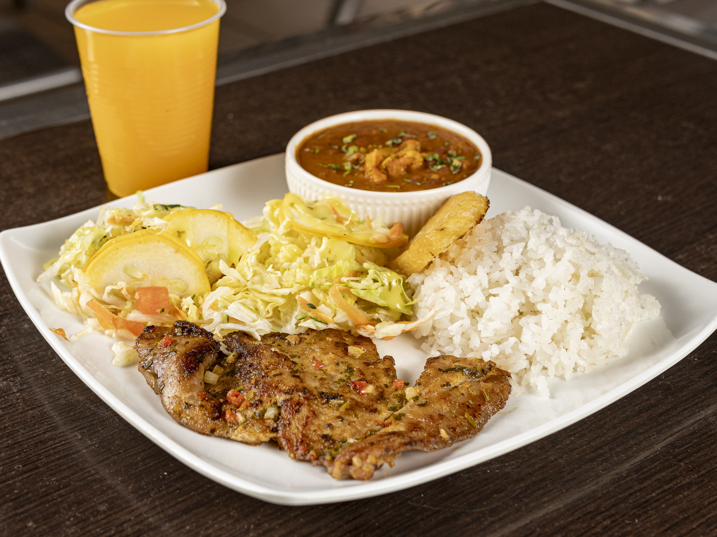 Bandeja Chuleta a elección (Pollo o Cerdo) acompañada por arroz, ensalada, maduro, arepa frita y jugo del día.