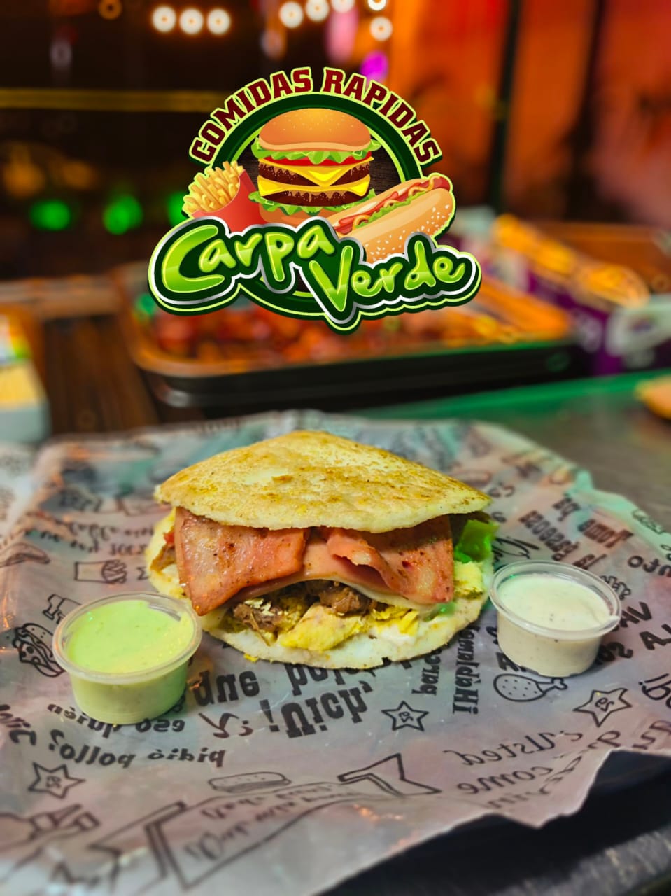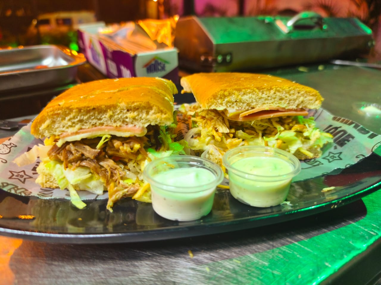 Carne desmechada, jamón, queso, lechuga, tomate, tocineta y salsas.