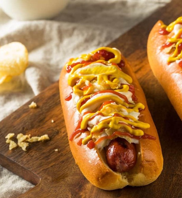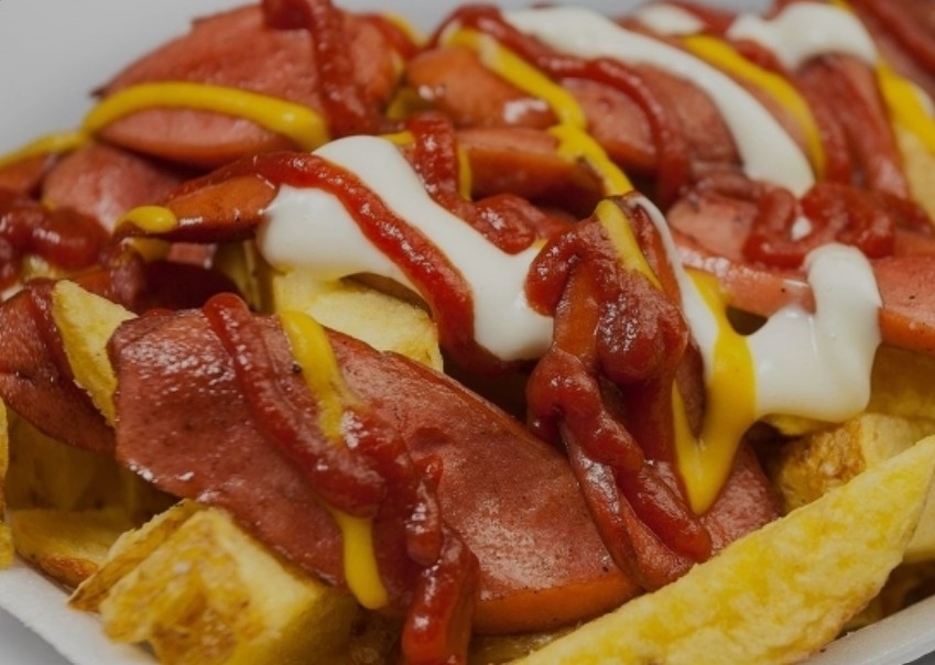Pan, salchicha, cebolla gratinada, ripio de papas y salsas.