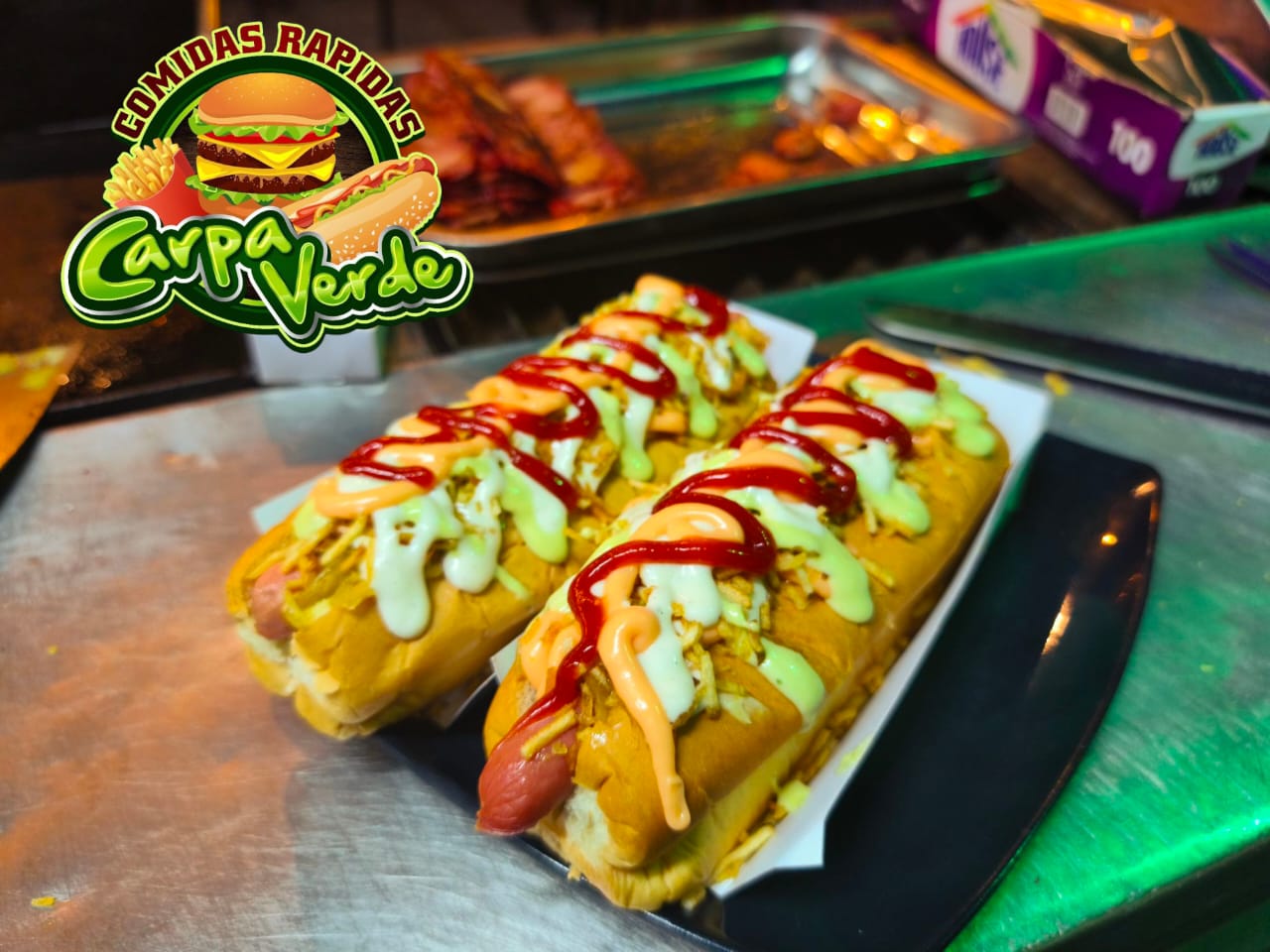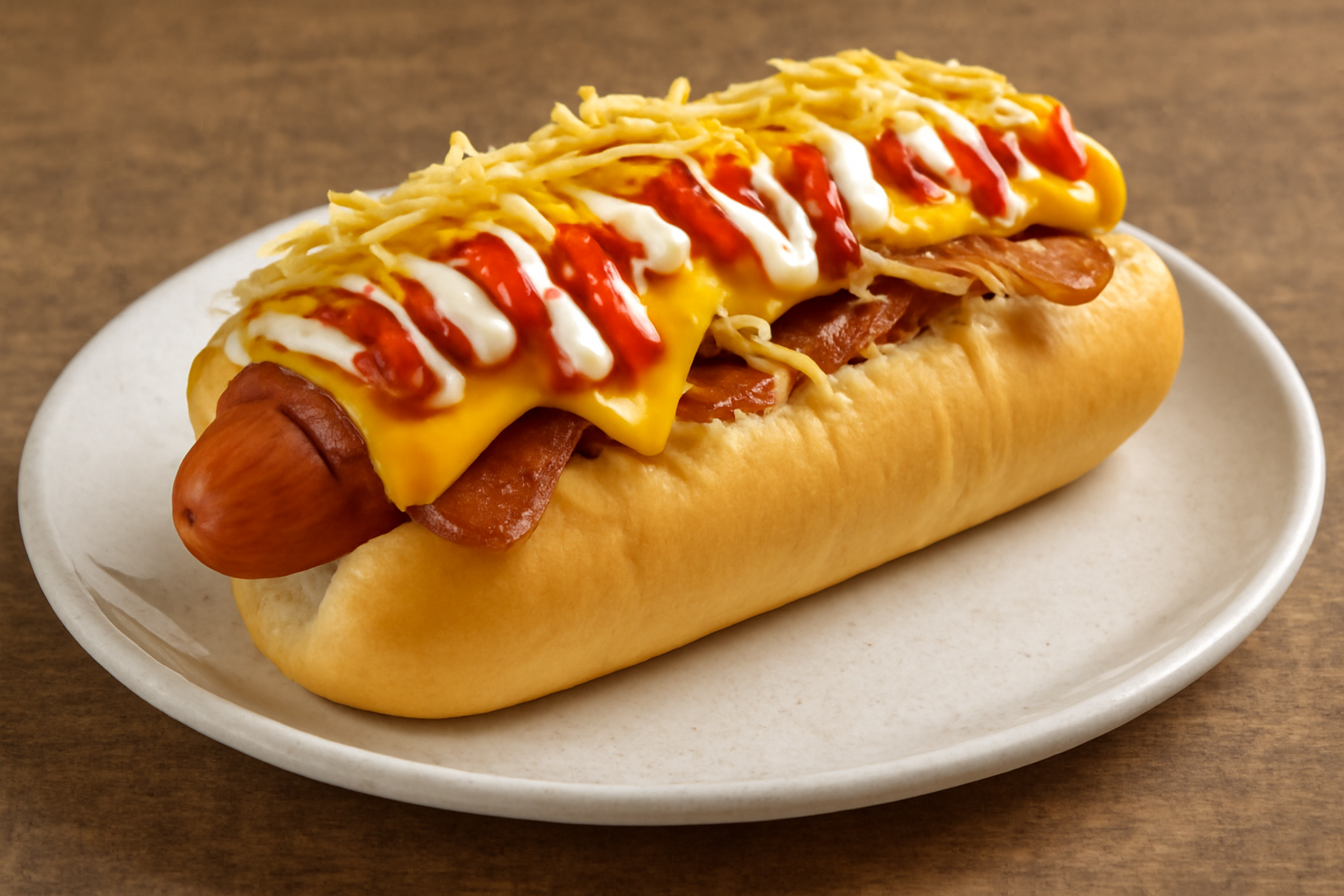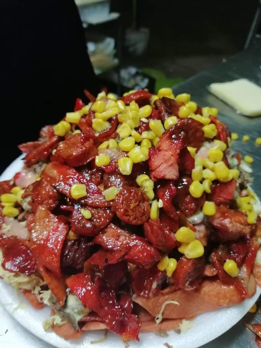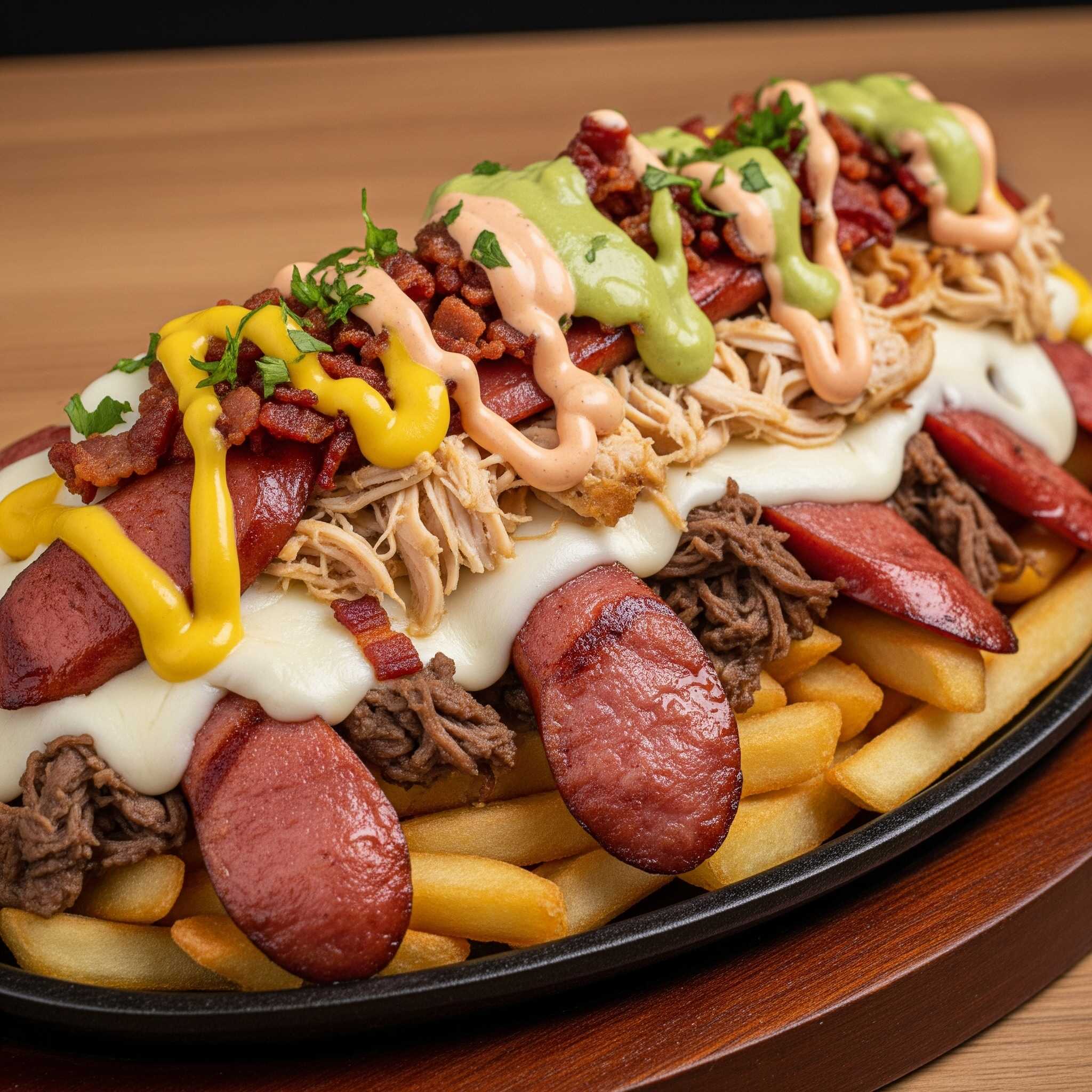 Pan, salchicha, cebolla gratinada, pollo desmechado, tocineta, ripio de papas y salsas.
