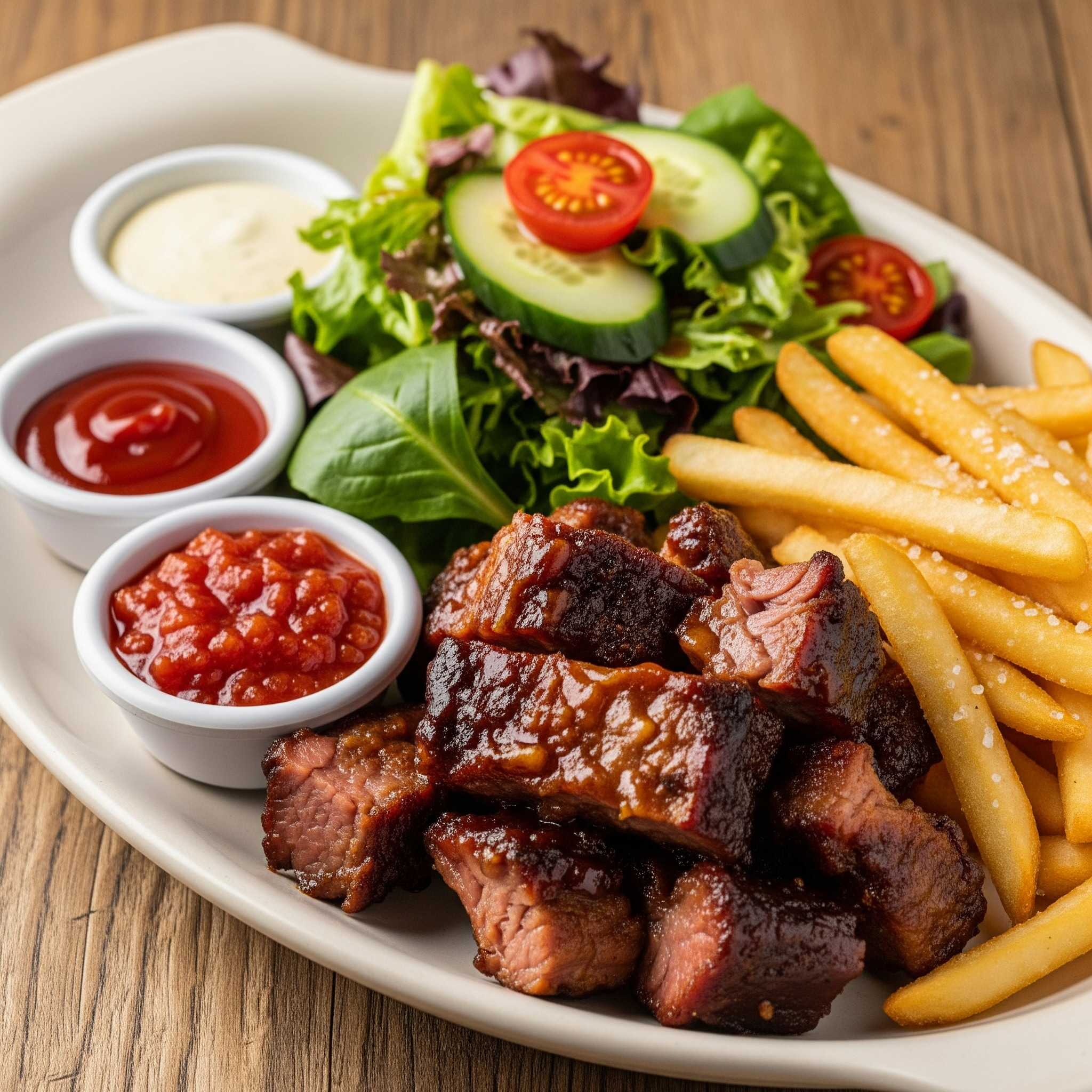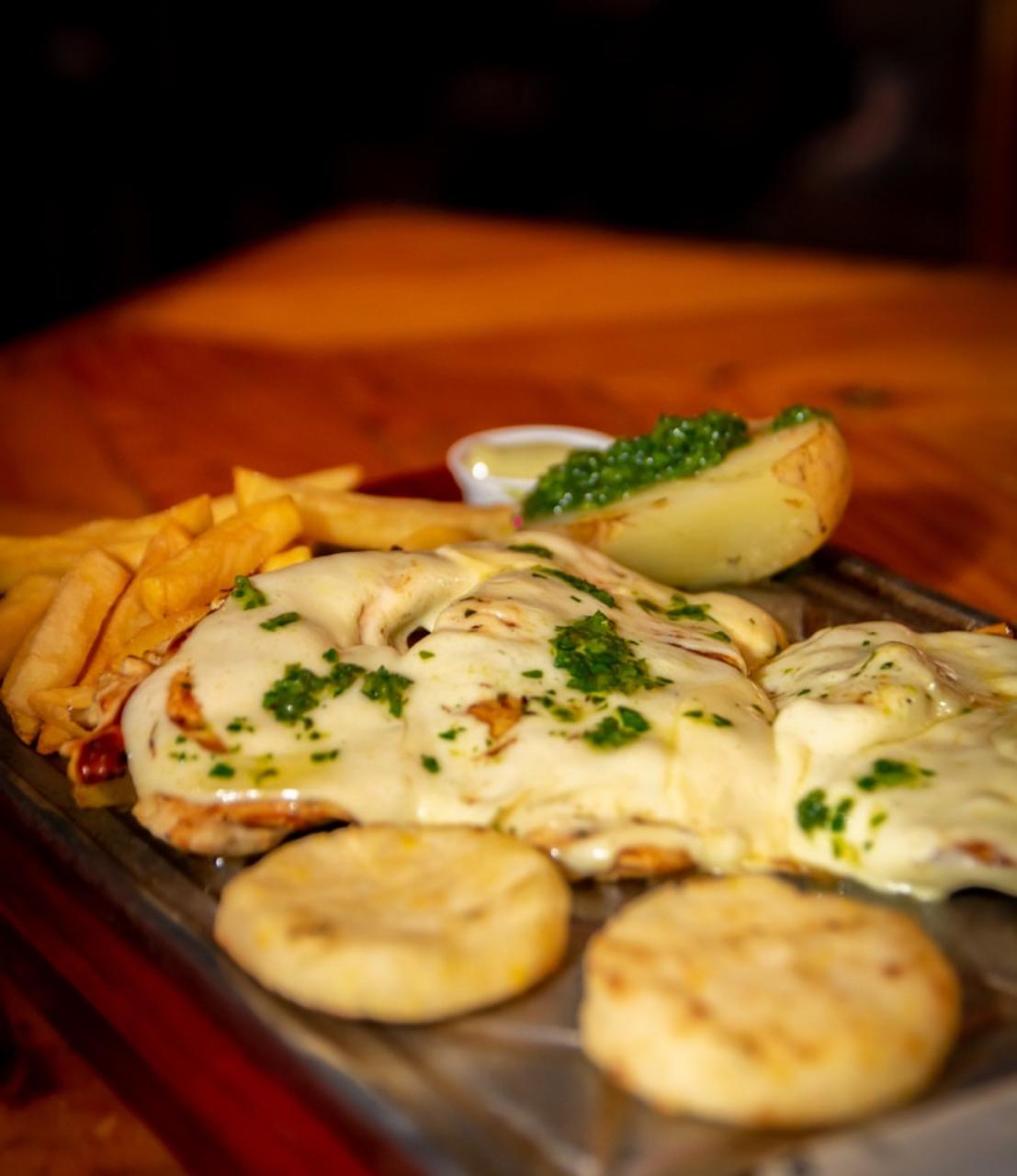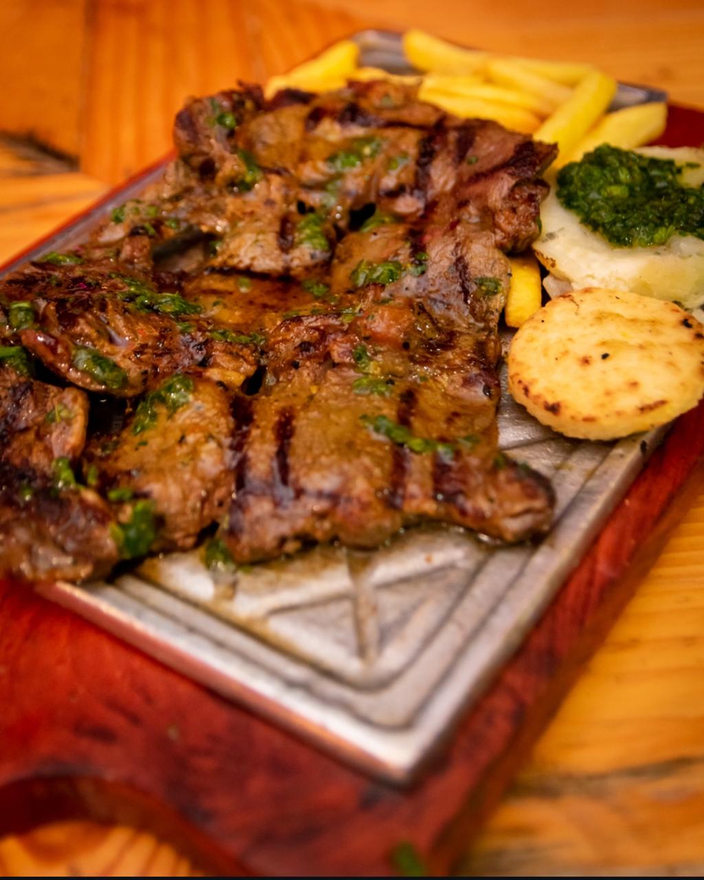 Carne, pollo, chorizo, costilla, papas, ensalada y salsas.