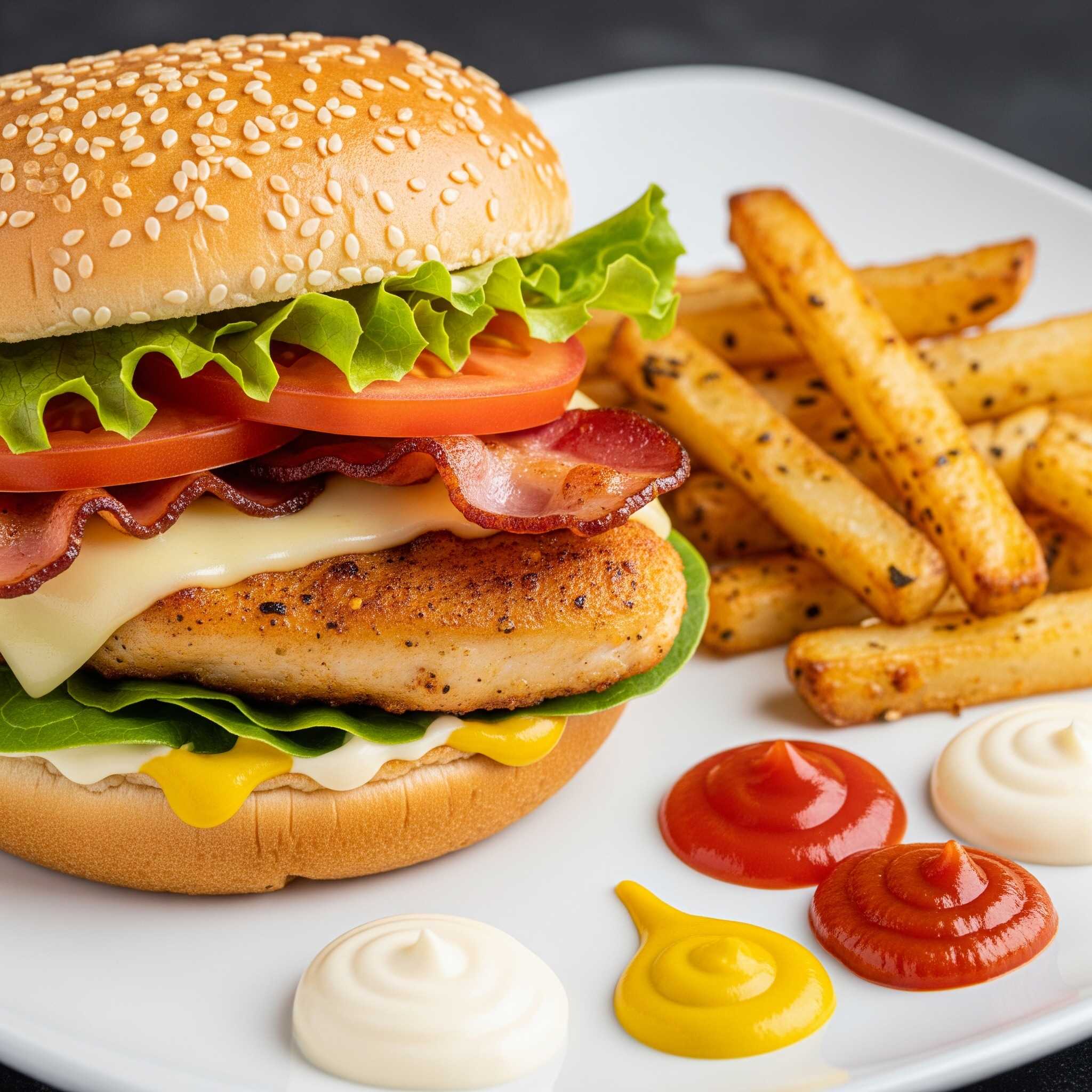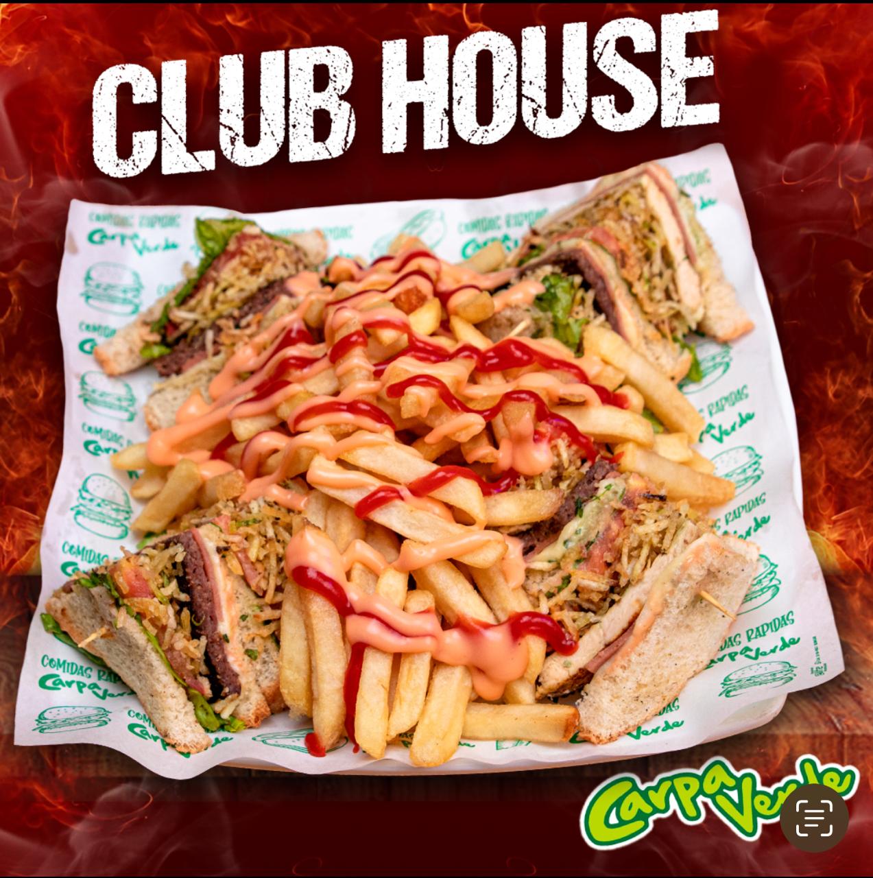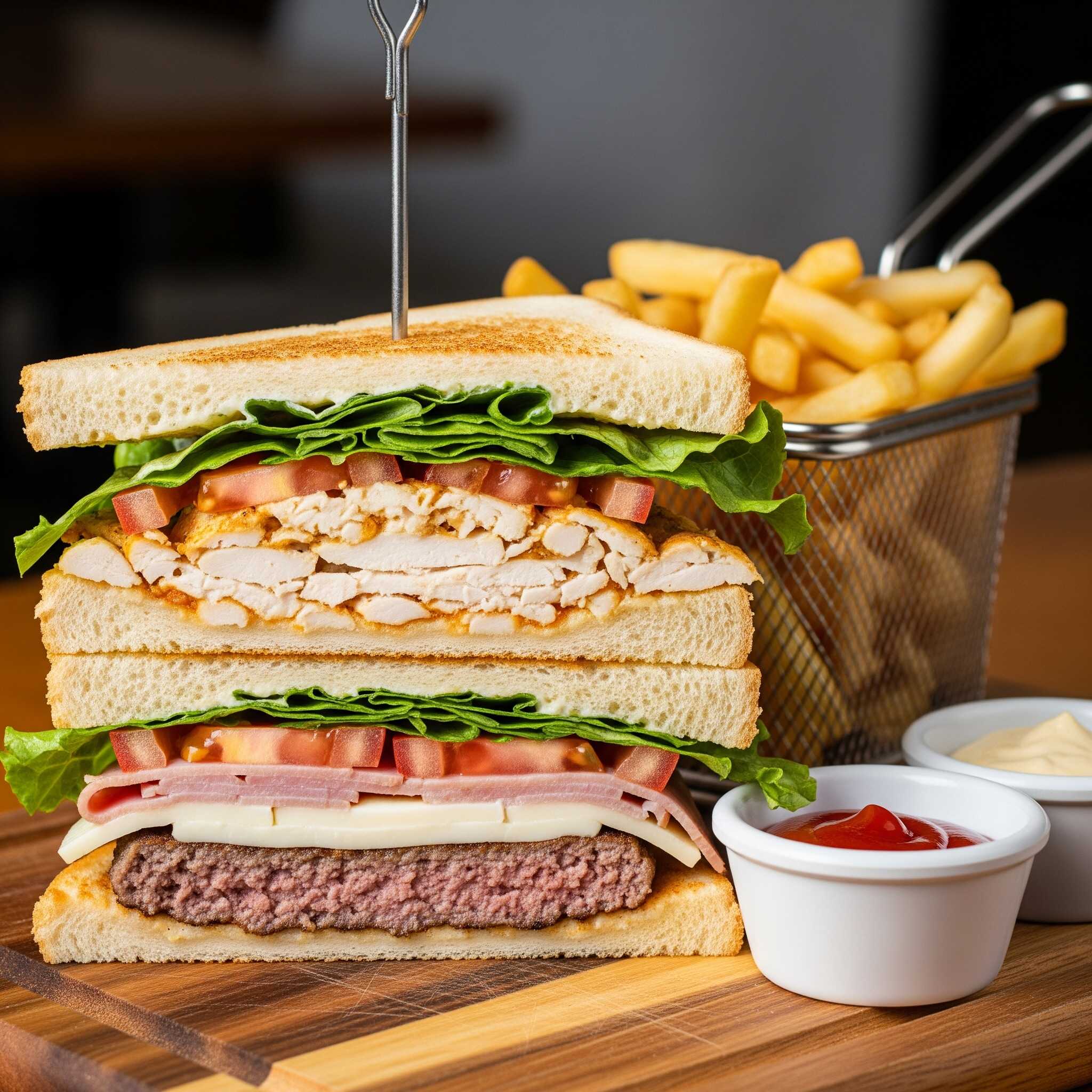Pan sándwich, carne de hamburguesa, jamón, queso, pollo, tomate, batavia, papas a la francesa y salsas.