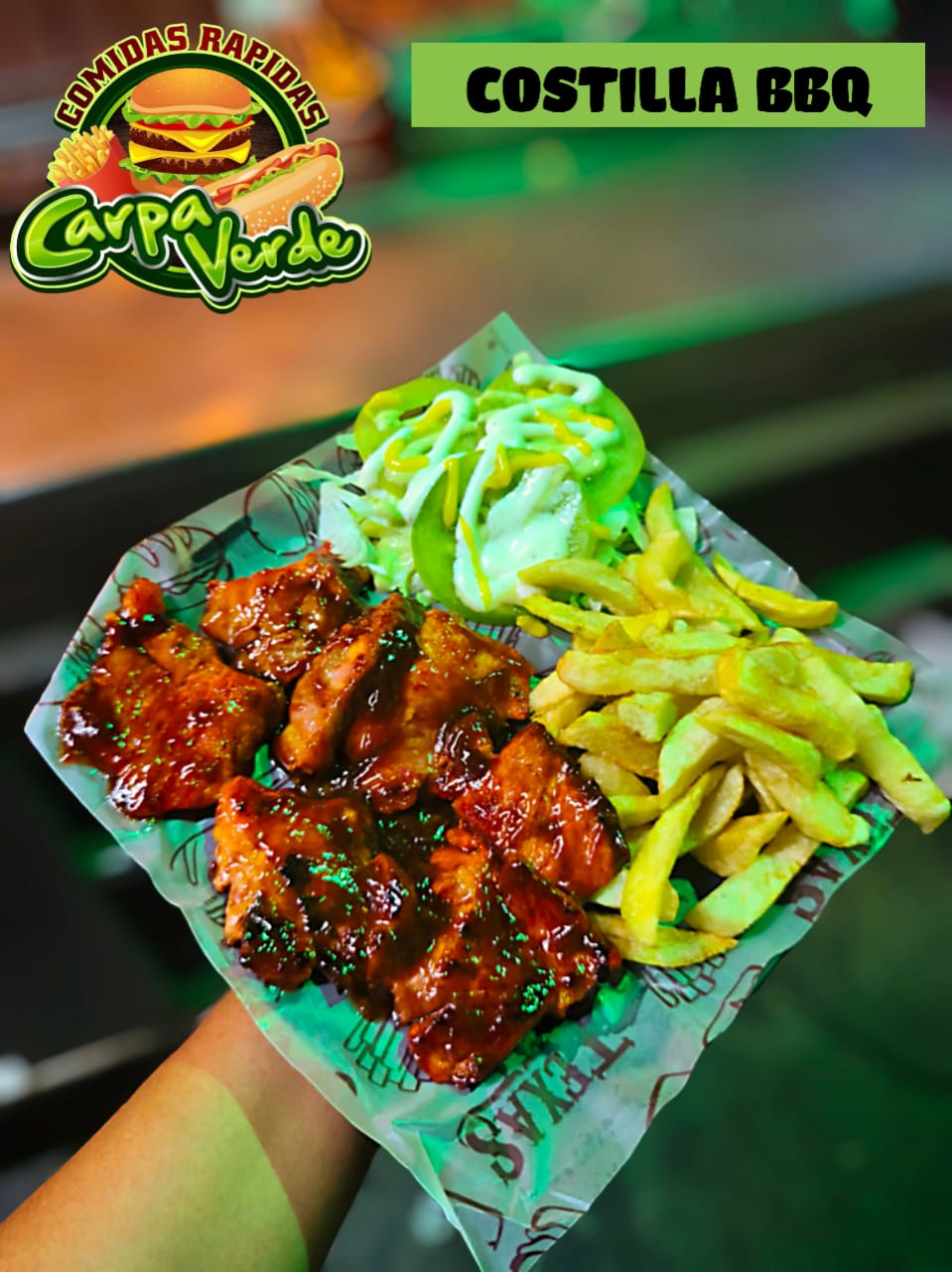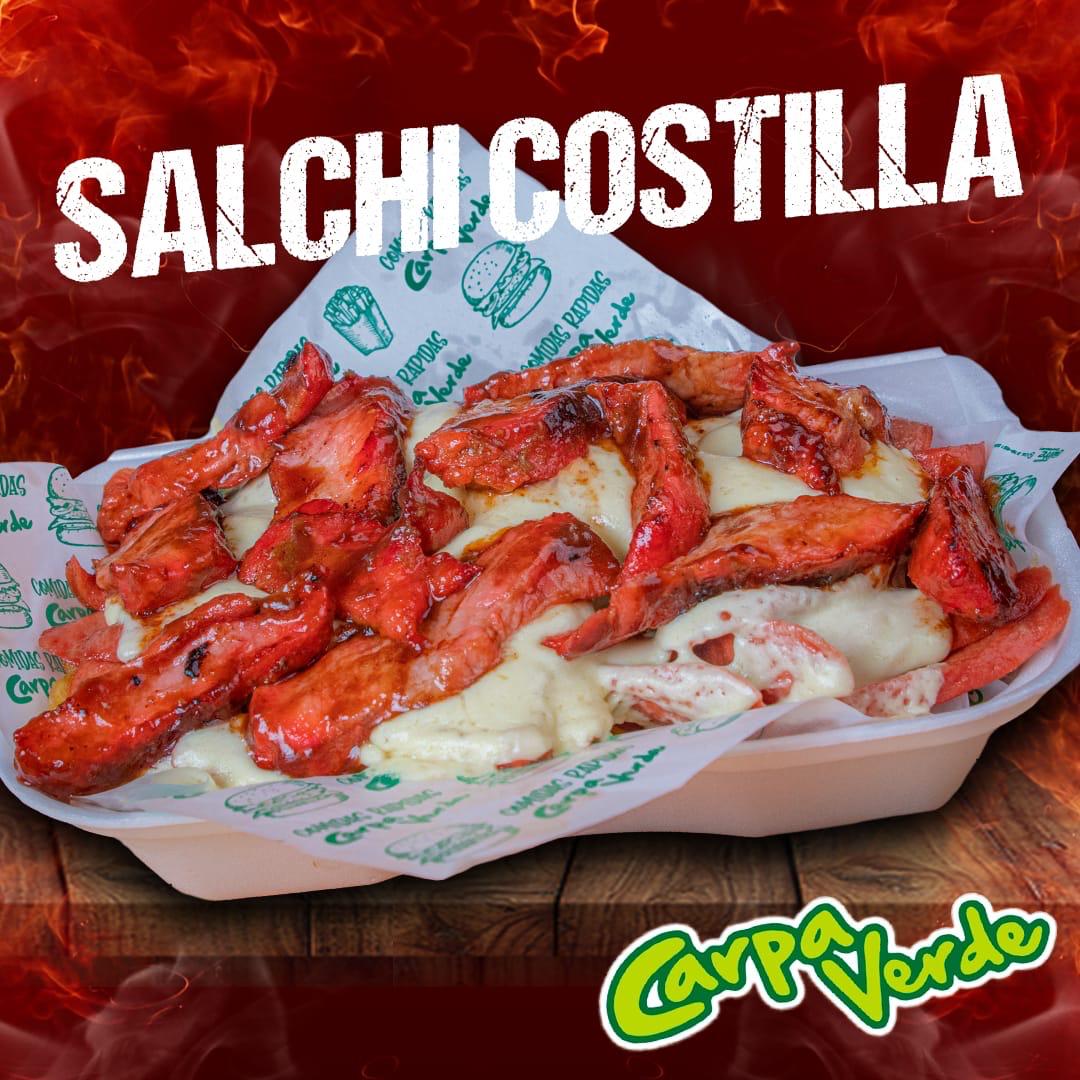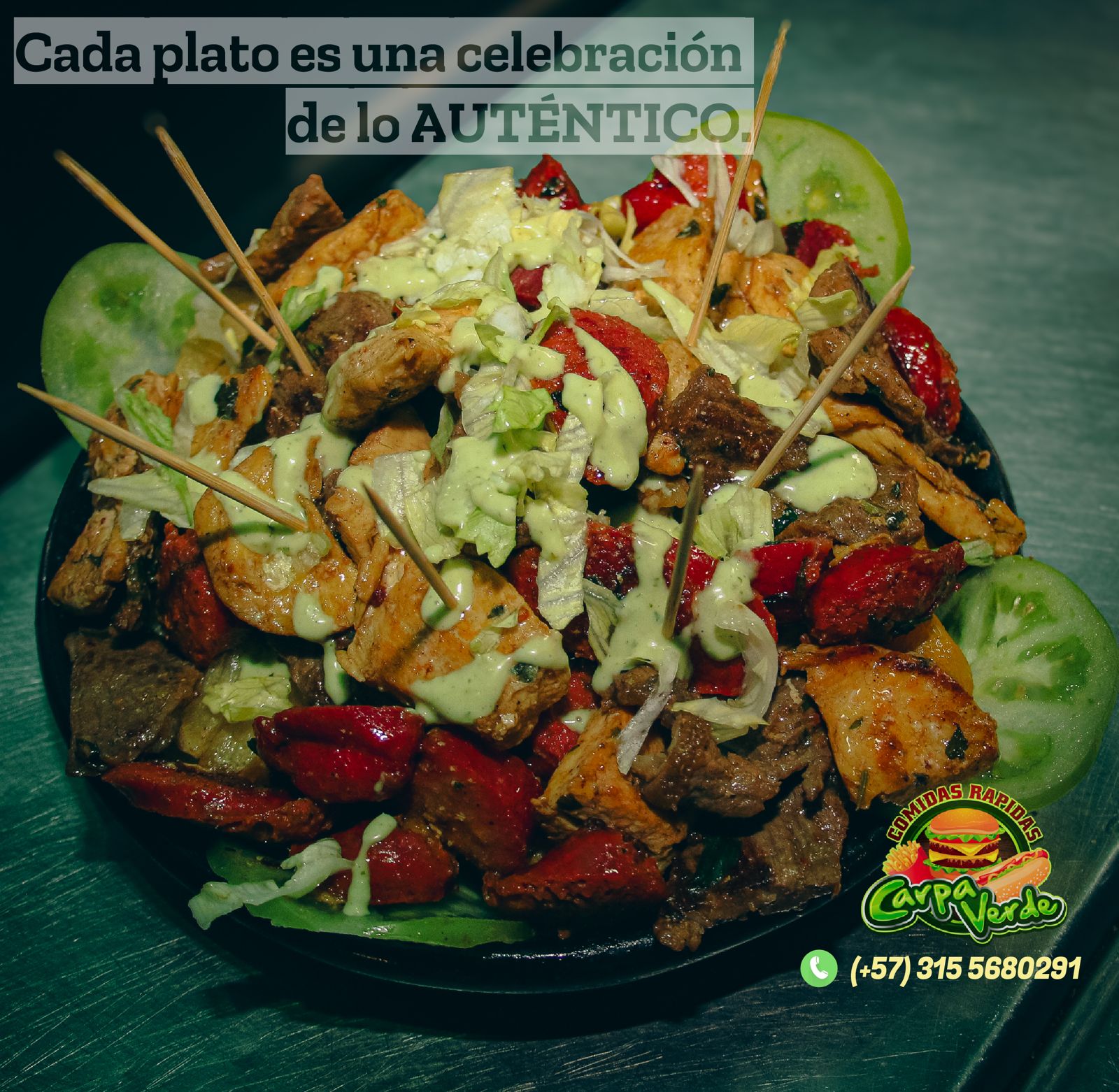 Papa, salchicha, tocineta, chorizo, costilla, carne, pollo, maicitos, queso y ripio.