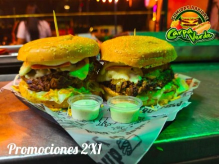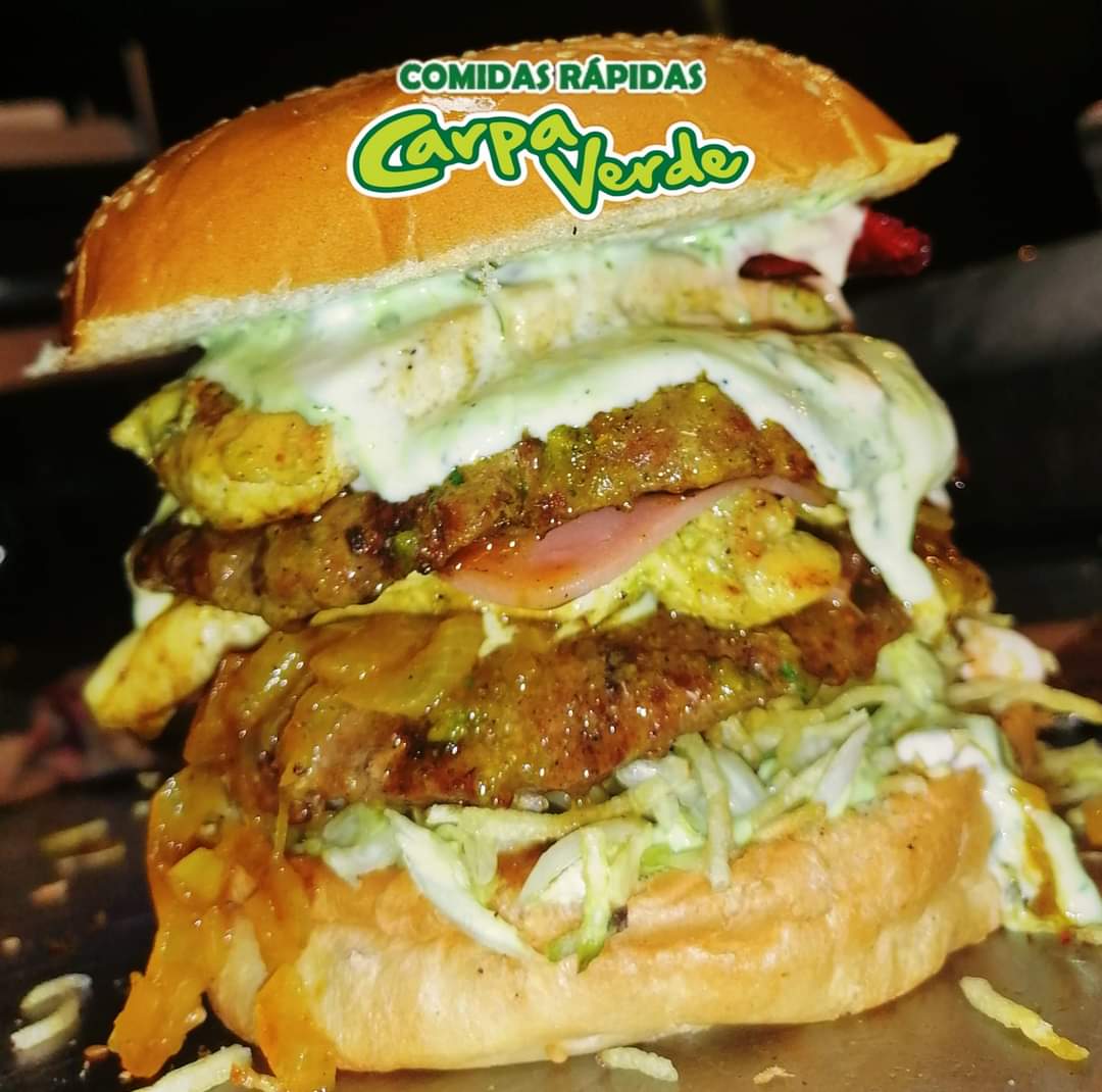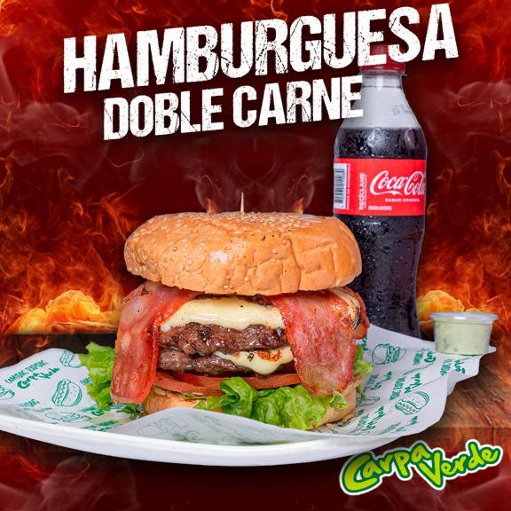 2 Hamburguesas con pan, carne, queso, jamón, lechuga, cebolla, tomate, tocineta, ripio y salsas.