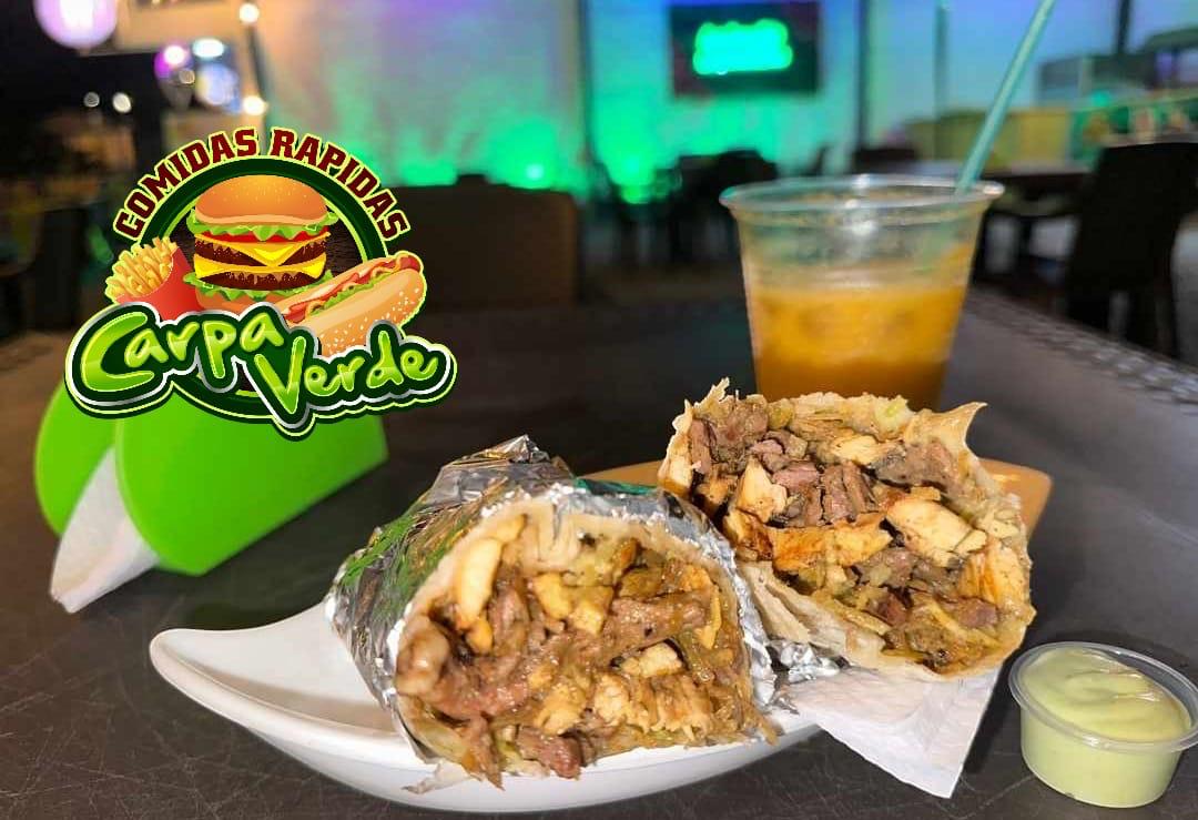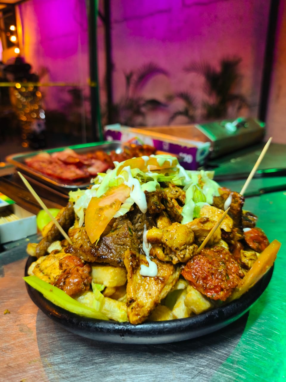 Tortilla árabe con trozos de carne y pollo asado, cebolla caramelizada, vegetales, salsa de ajo y ripio de papas.