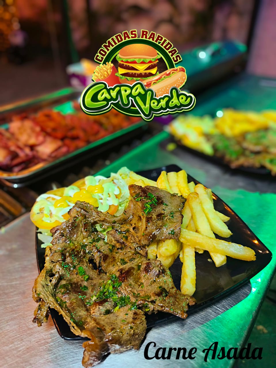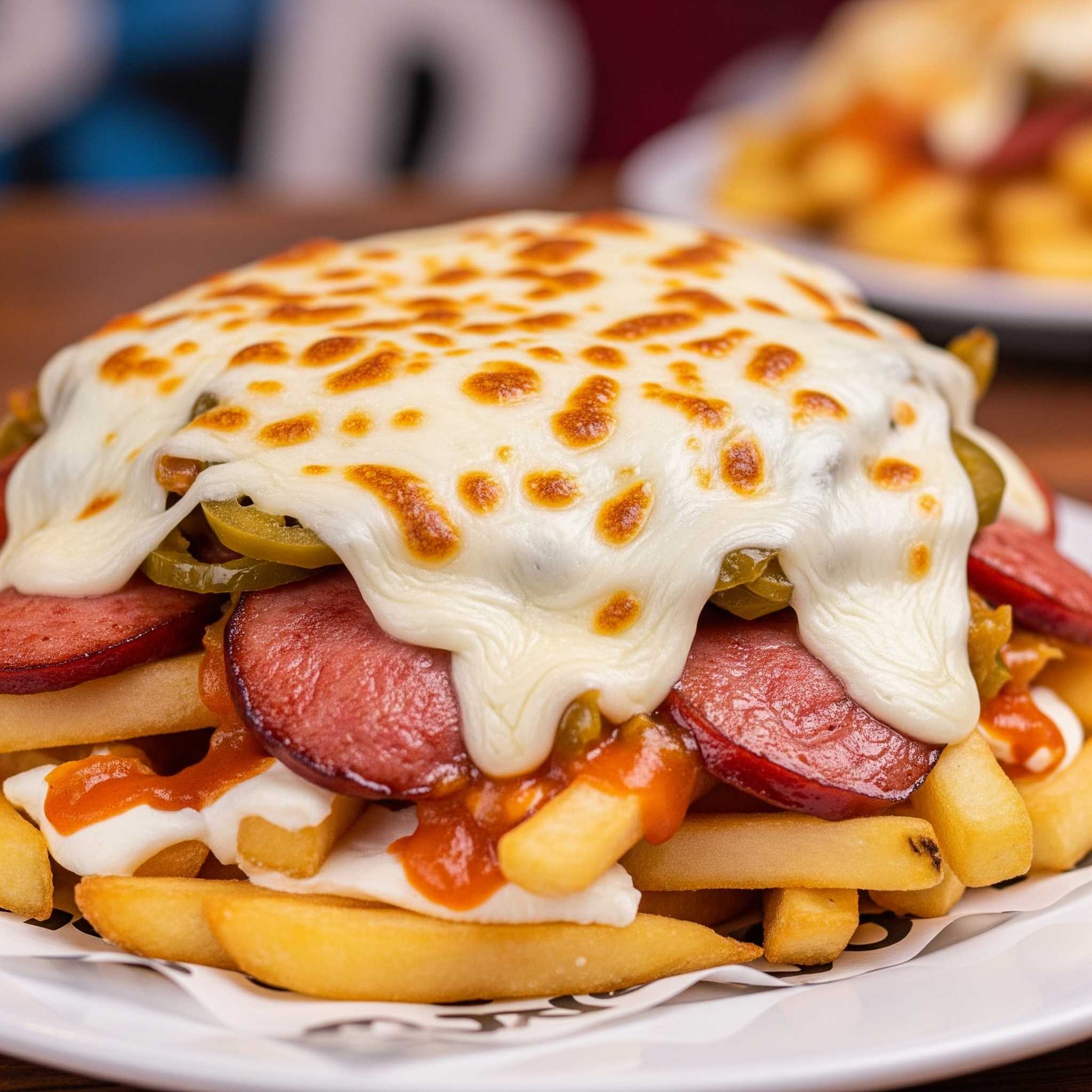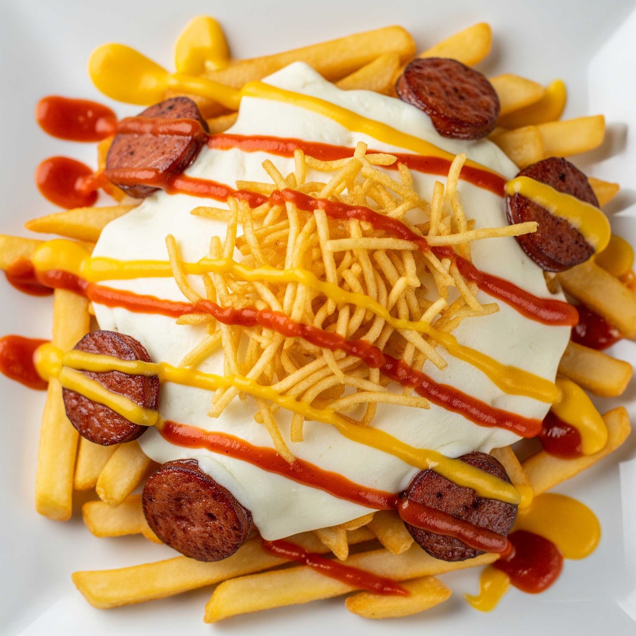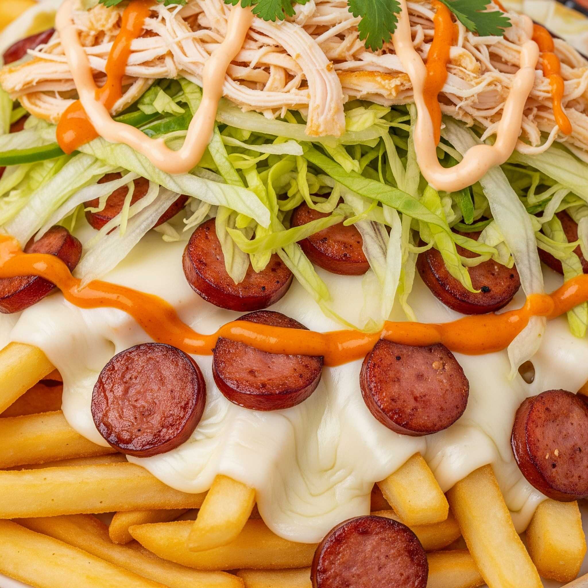 Papa, salchicha, queso, carne de hamburguesa, lechuga y ripio.