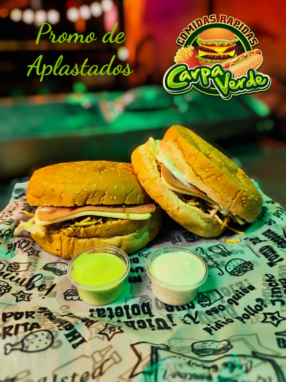2 aplastados con pan, jamón, queso, lechuga, tomate, ripio y salsas acompañados de gaseosa postobon 250ml, sabor dependiendo del stock