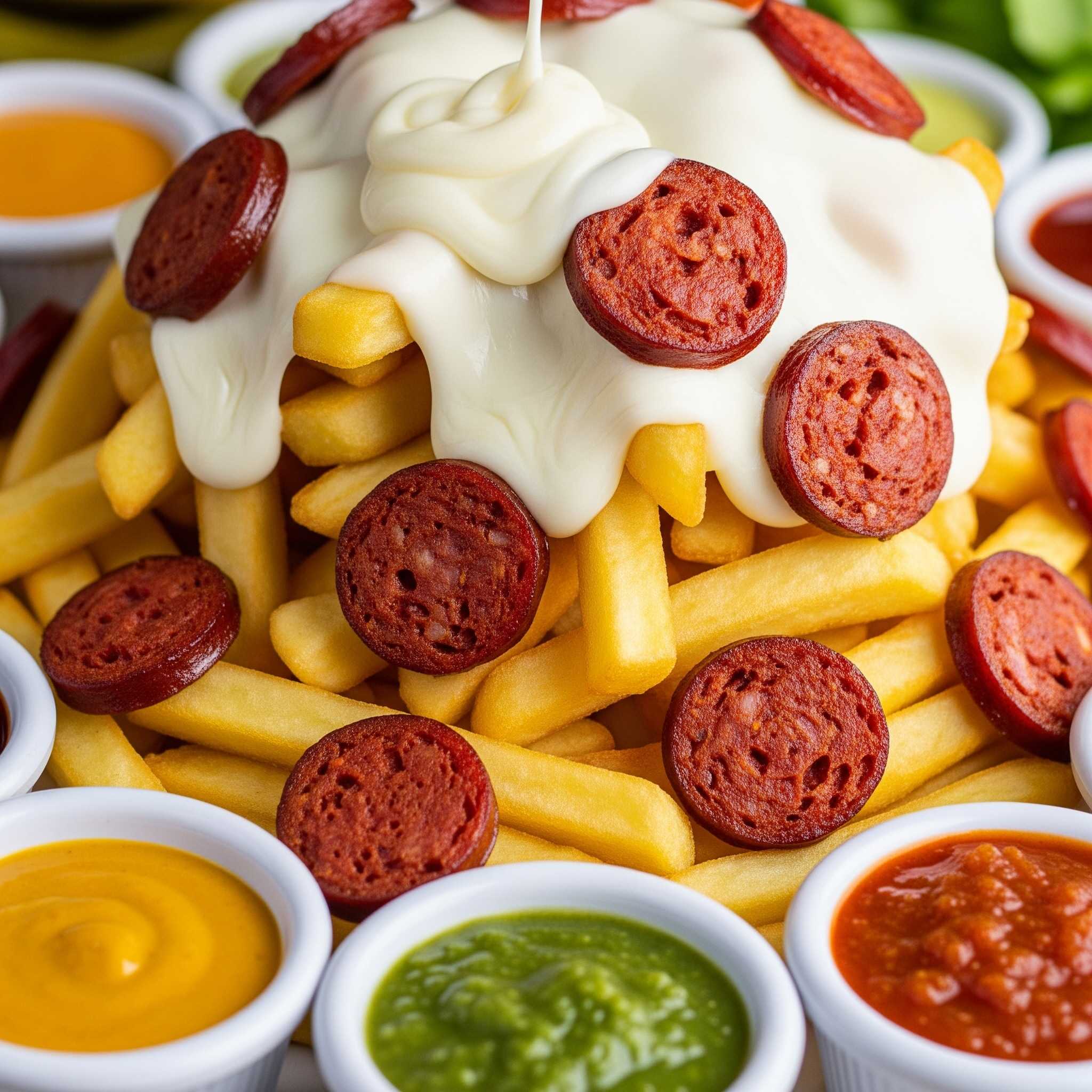 Papa, salchicha, tocineta, carne, pollo, queso y ripio.
