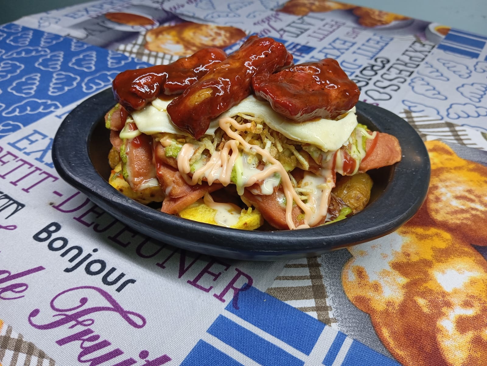 Salchicha, papa, queso, costilla, salsa de la casa.