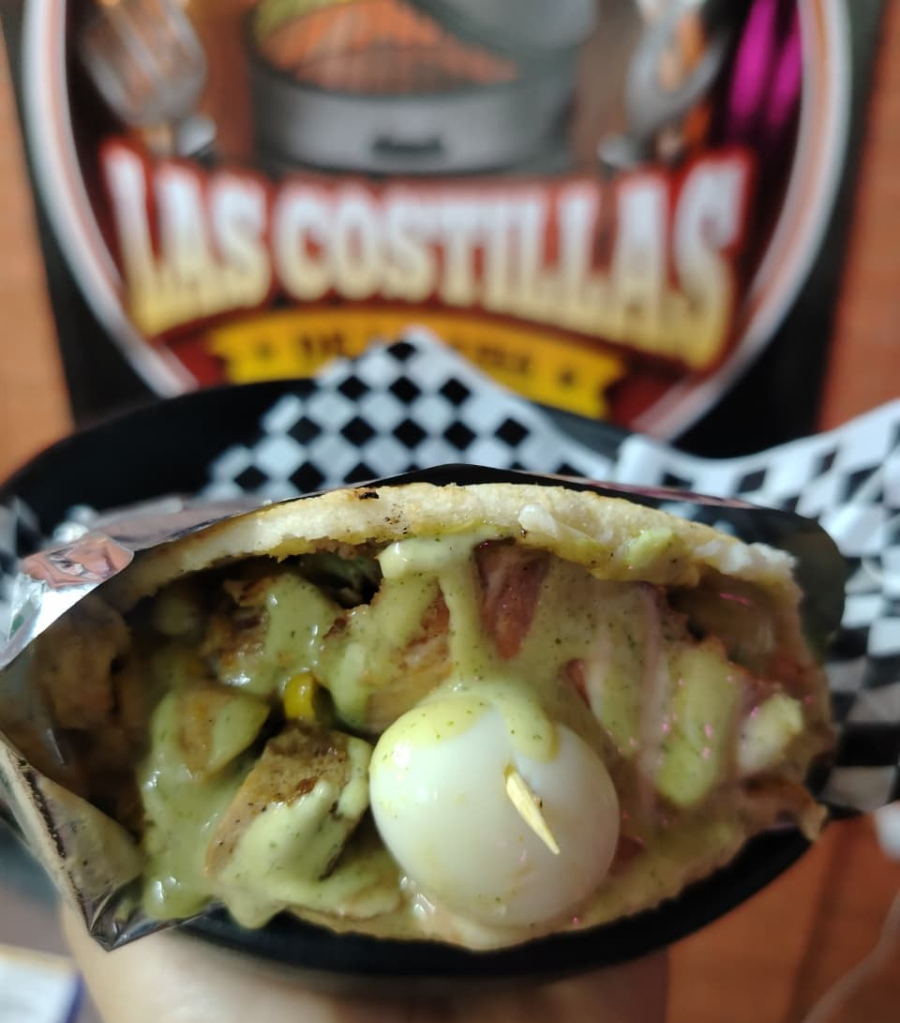 Arepa de maiz, chicharron, carne desmechada de res, pollo desmechado bañados en ahogado casero acompañado de huevo de codorniz y salsa de la casa a elección.