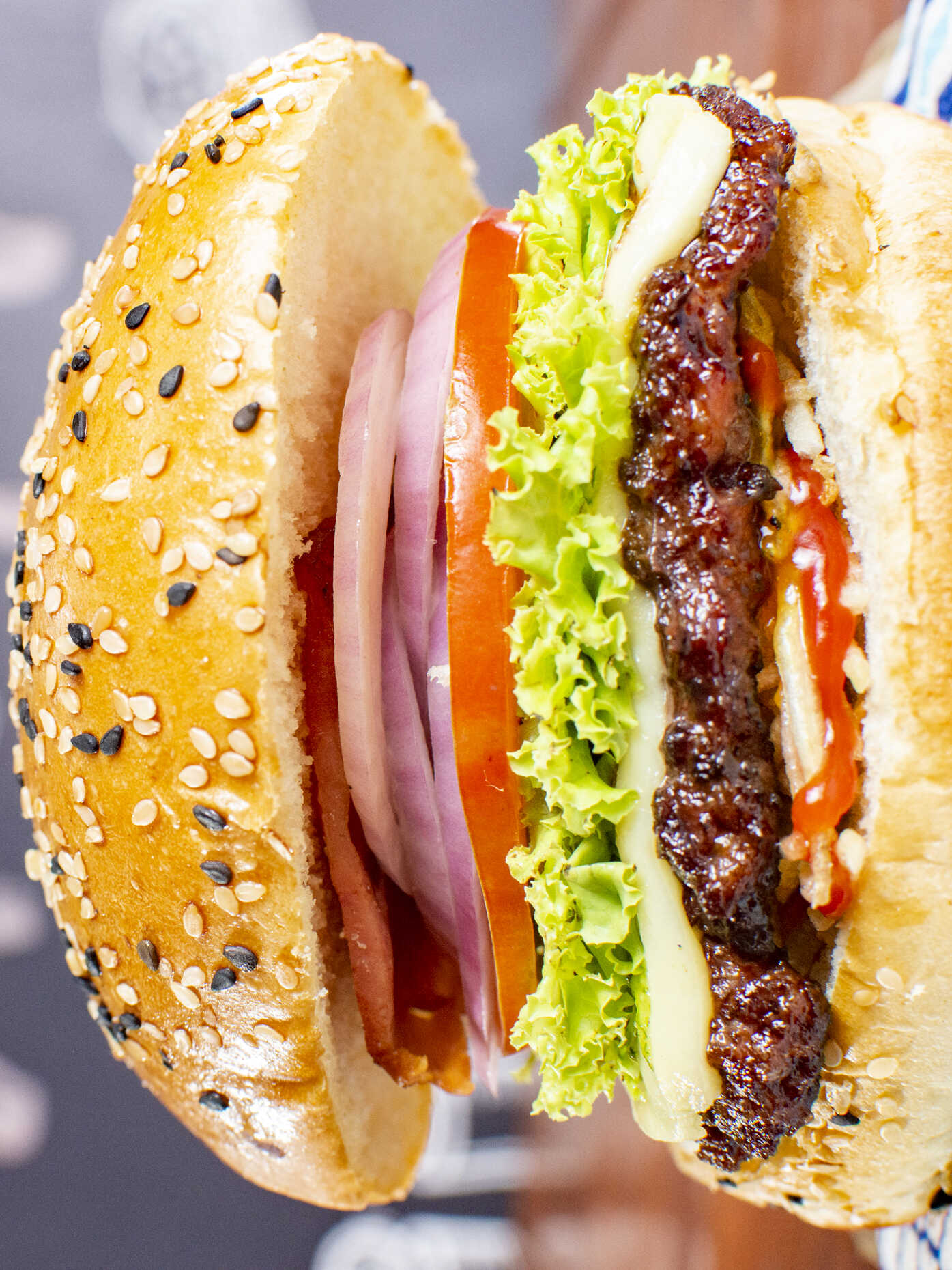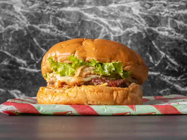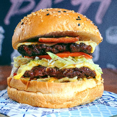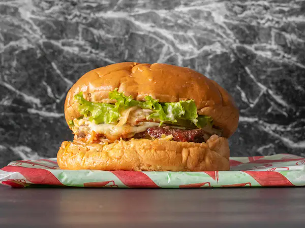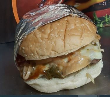 Res, tocineta, cebolla, tomate, lechuga y salsa cheddar.
