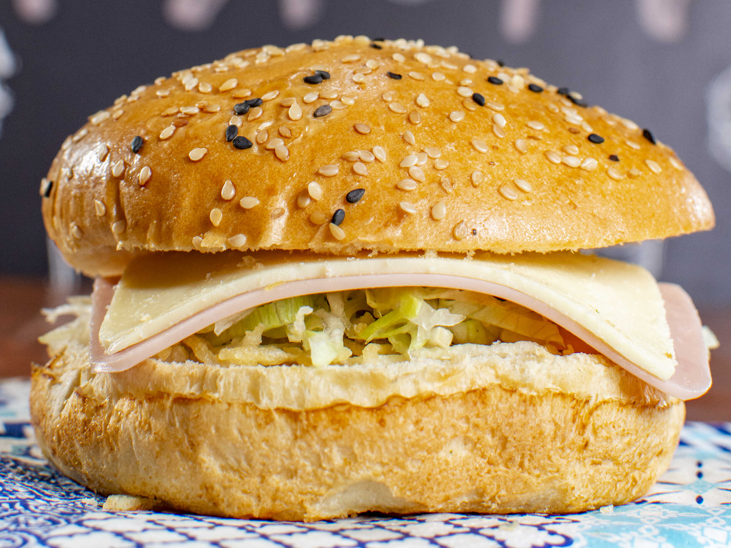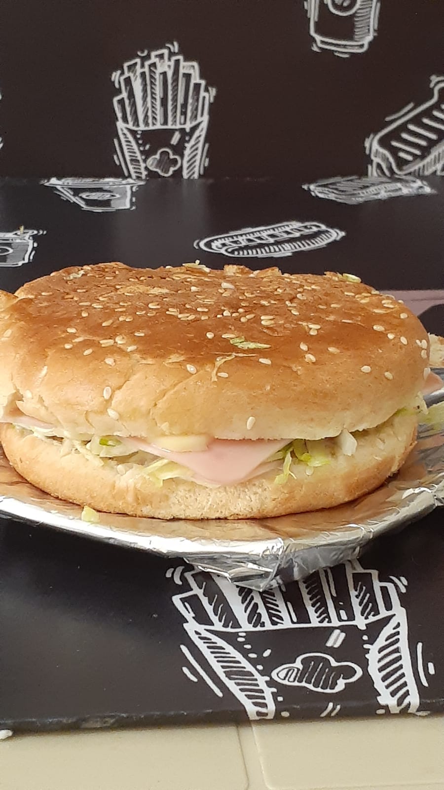 Pan hamburguesa, ripio de papa, jamón y queso.