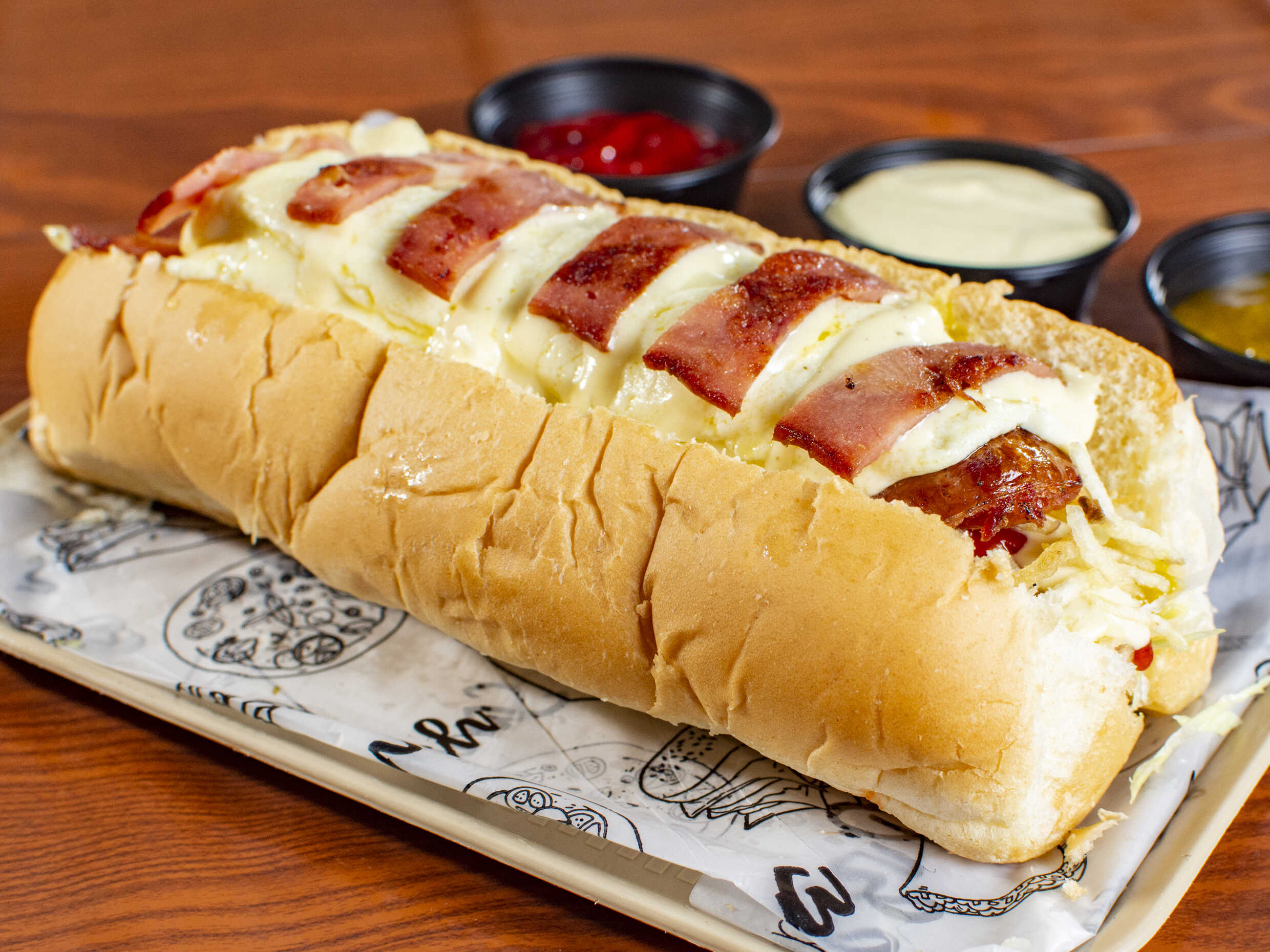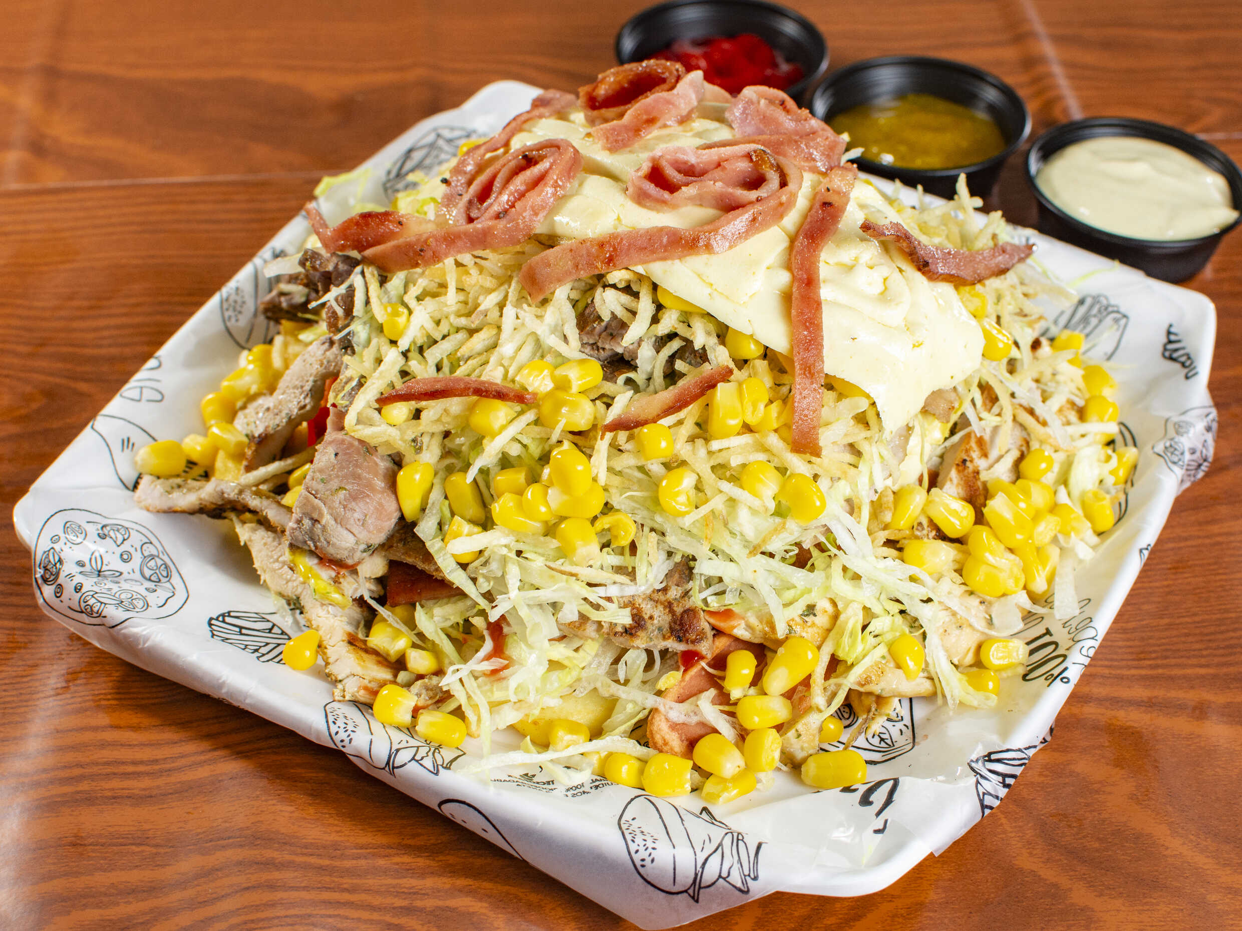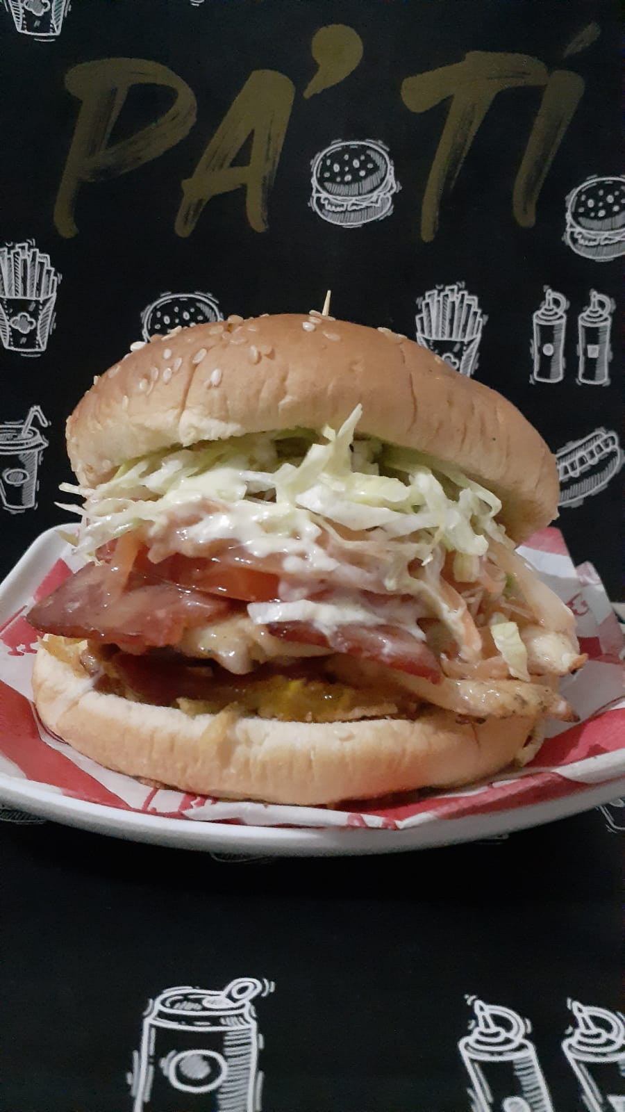 Carne de res 90gr, tocineta, doble salchicha ranchera, queso, ripio de papa, lechuga y tomate con salsa de tomate, salsa de piña y salsa de la casa