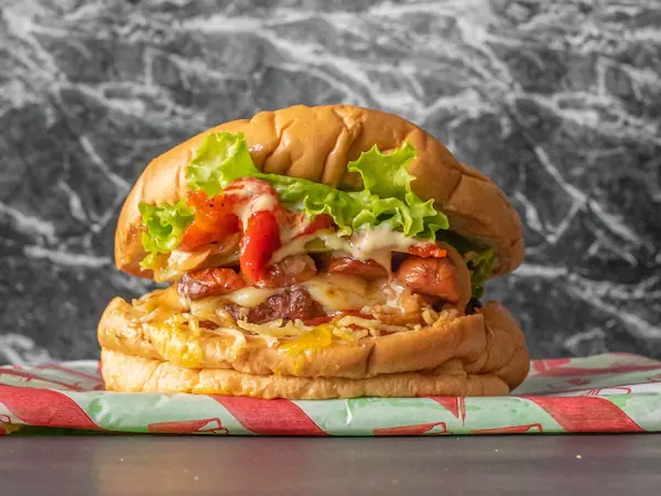 Carne de res, salchicha Zenú, tocineta, ripio de papa y lechuga.