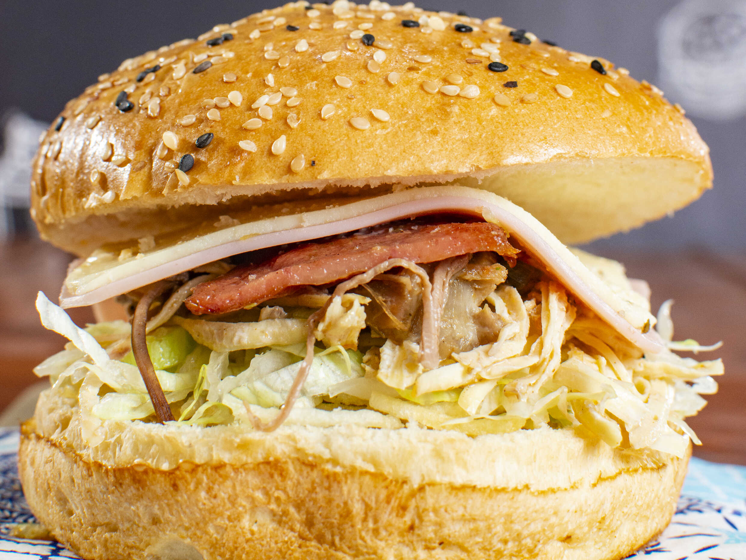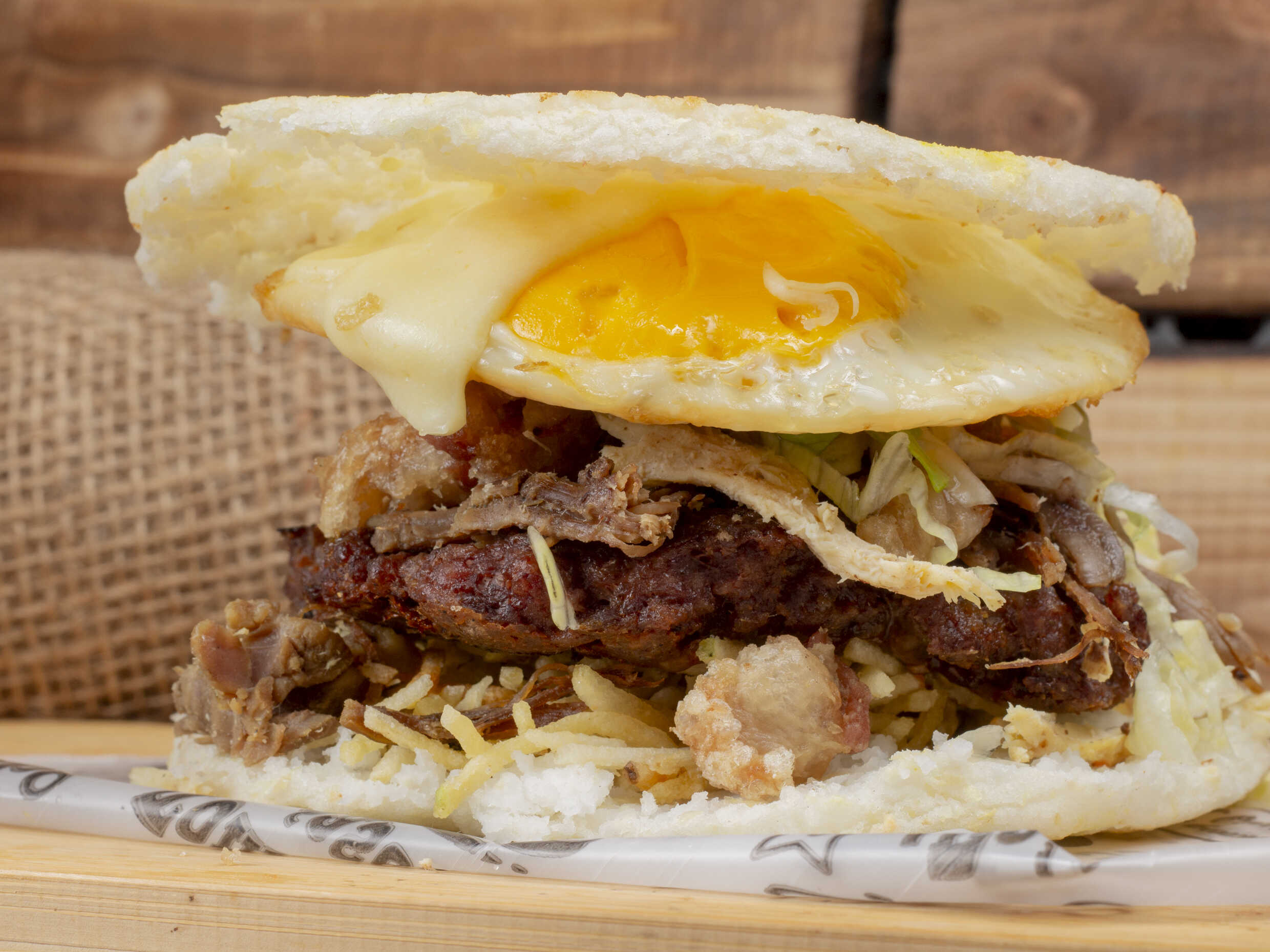 Pollo desmechado, pan hamburguesa, ripio de papa, jamón, queso y tocineta.