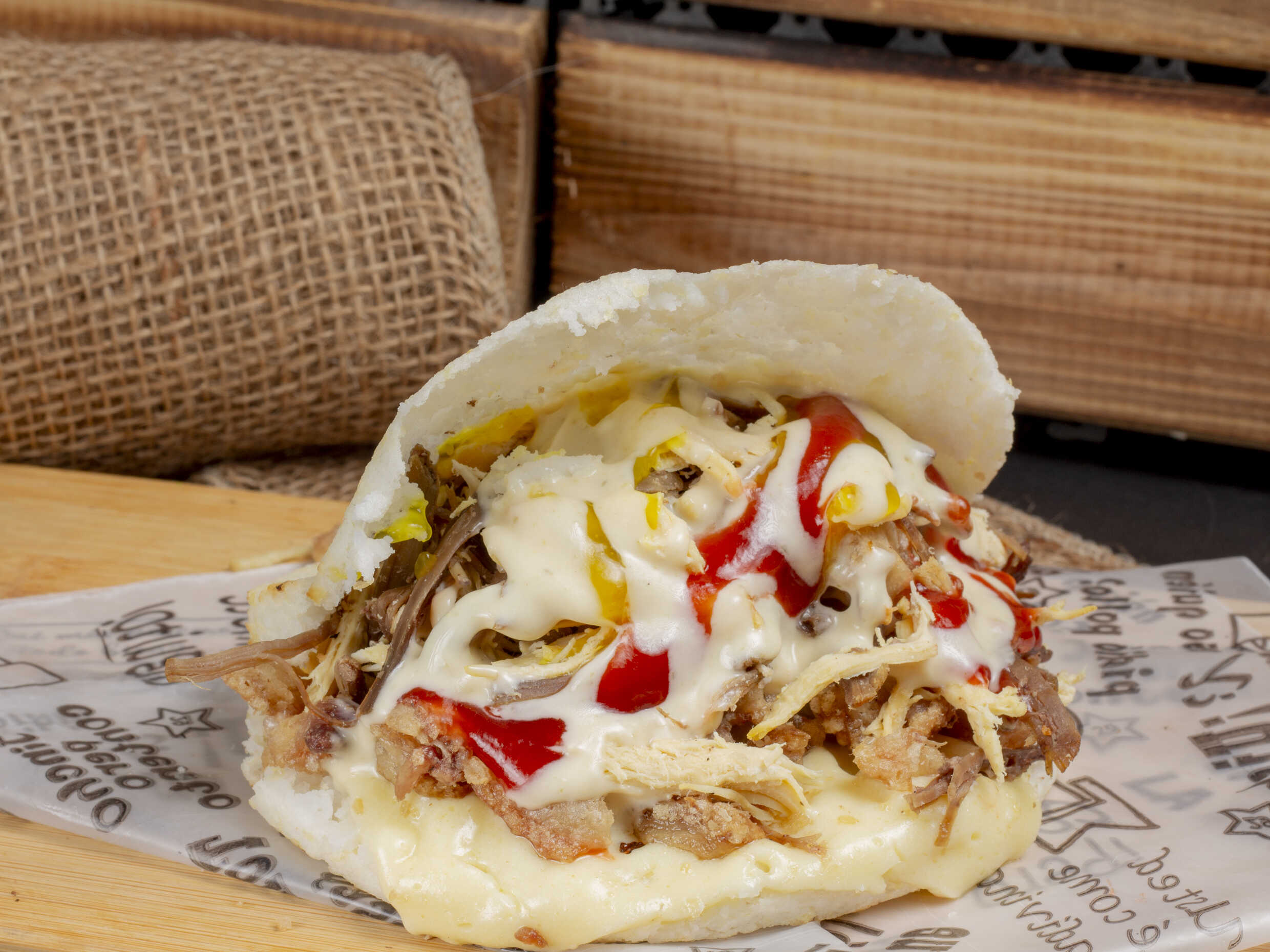 Arepa con relleno de carne desmechada, pollo desmechado, chicharrón, queso y huevo de codorniz.