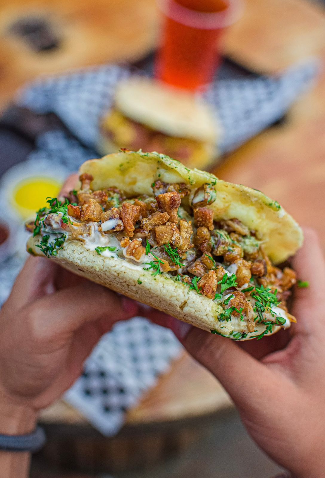 Arepa mixta de res y pollo en salsa de champiñones queso fundido y trocitos de chicharron crocante