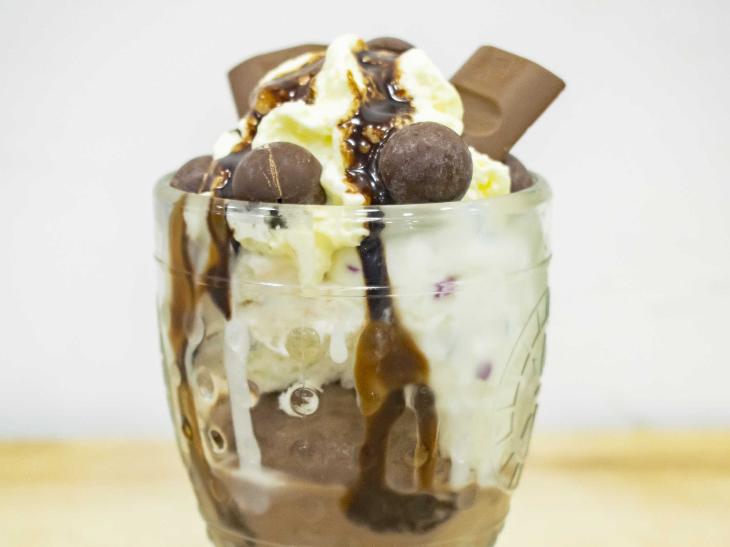 Dos bolas de helado, chocolatina, balones, chantilly, hersheys.