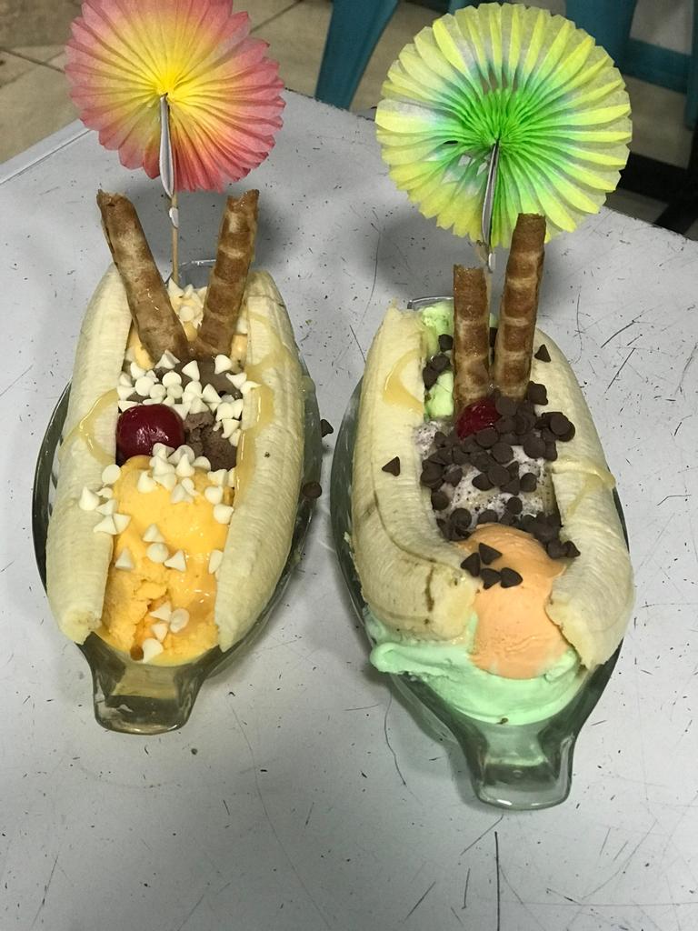 Fresa, banano, salsa de frutos rojos, arequipe, chantilly, cereza y un sabor de helado.