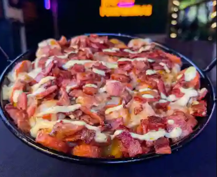 Papa amarilla, salchicha americana, queso mozzarella fundido, tocineta y salsa de la casa.
