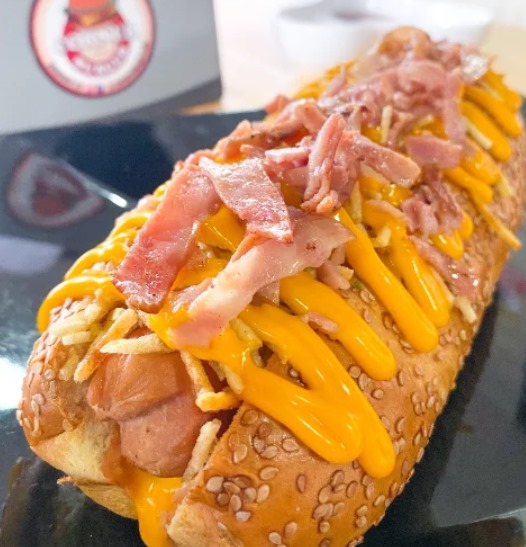 Pan artesanal, salchicha alemanada envuelta en tocineta ahumada, queso mozzarella, cebolla caramelizada, ripio y salsa de la casa.