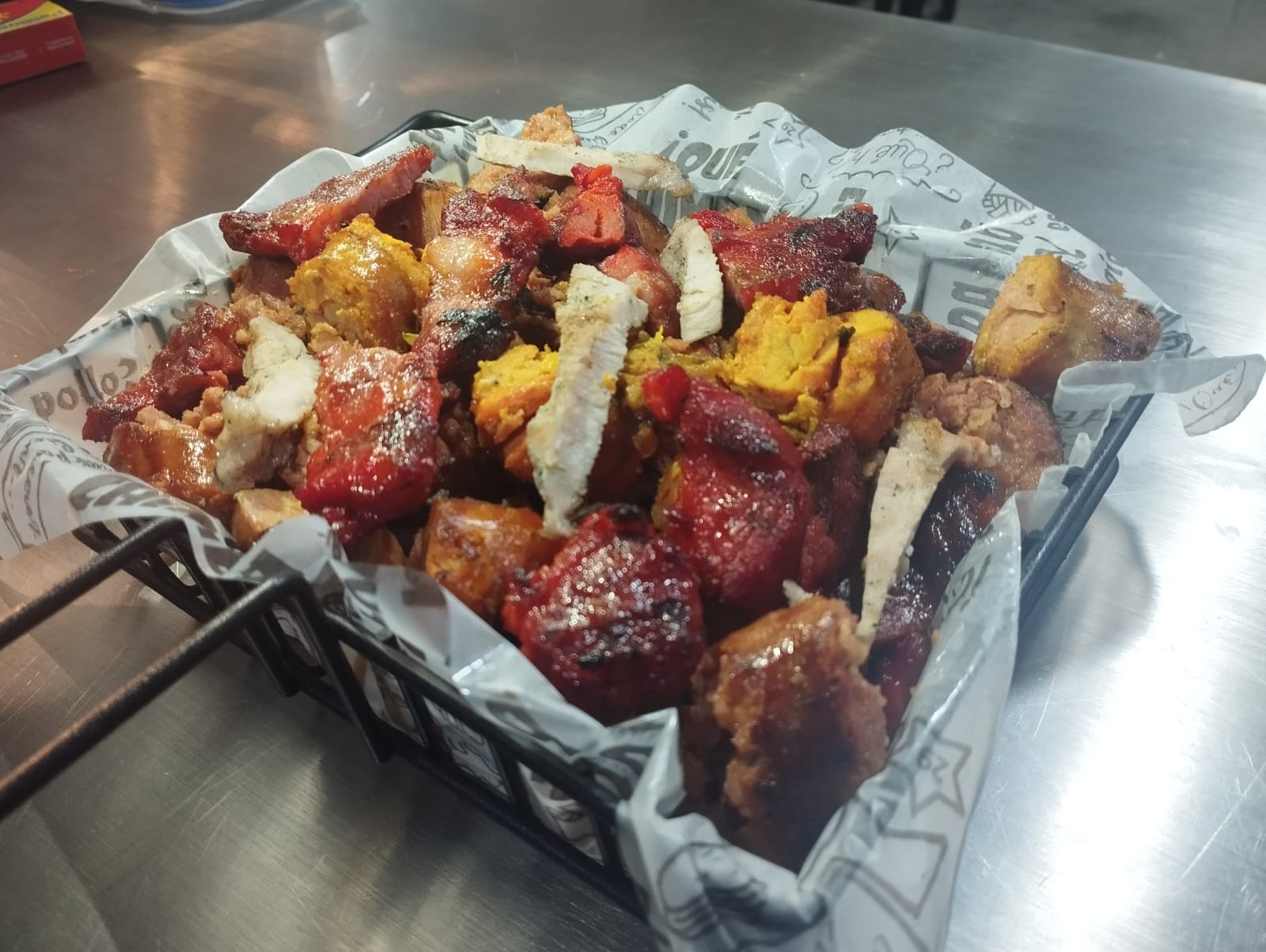Trozos de carne, trozos de pollo, chorizo ahumado, costilla ahumada, papas a la francesa y papa amarilla.